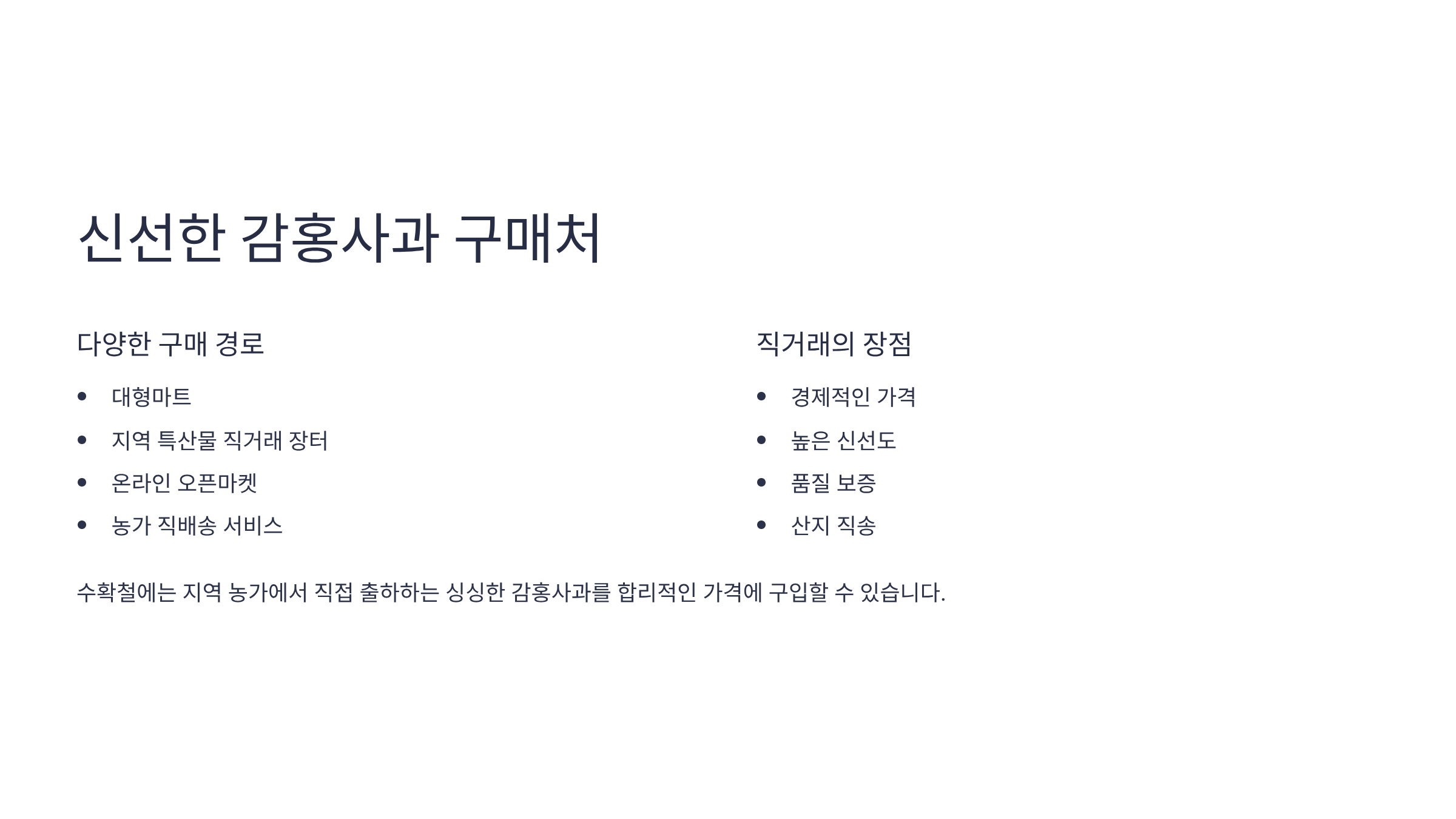 신선한 감홍사과는 대형마트뿐만 아니라 지역 특산물 직거래 장터, 온라인 오픈마켓, 농가 직배송 서비스를 통해 합리적인 가격에 구입할 수 있습니다. 특히, 수확철에는 지역 농가에서 직접 출하하는 싱싱한 감홍사과를 구매할 수 있고, 산지에서도 저렴하게 구할 수 있습니다. 직거래는 가격도 경제적이고 신선도가 높으며 품질보증을 받을 수 있다는 장점이 있습니다.
