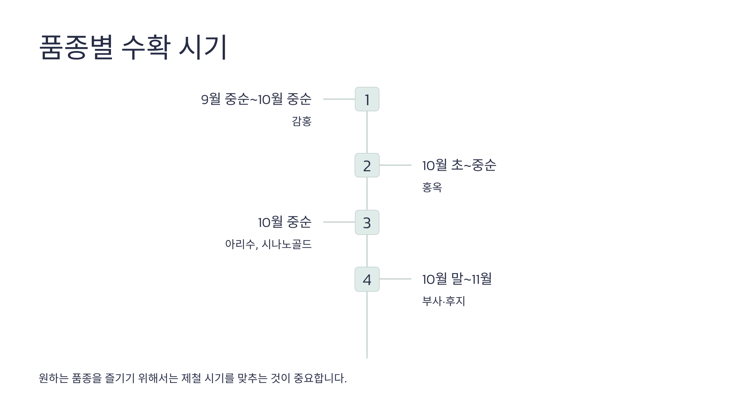 사과는 품종별로 수확기가 조금씩 다르므로 원하는 품종을 즐기기 위해서는 제철 시기를 맞추는 것이 중요합니다.