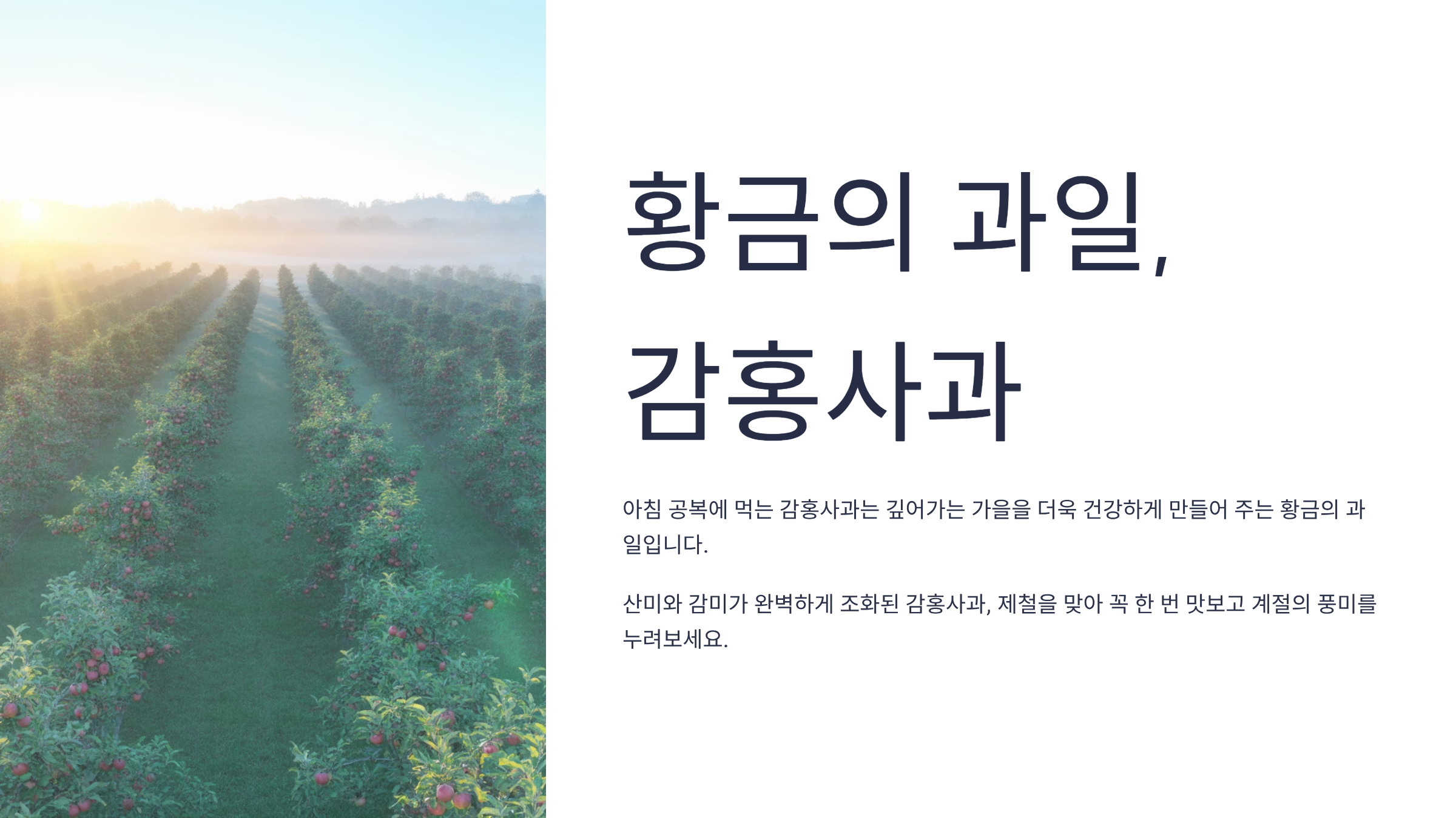 아침 공복에 먹는 감홍사과는 깊어가는 가을을 더욱 건강하게 만들어 주는 황금의 과일입니다. 산미와 감미가 완벽하게 조화된 감홍사과, 제철을 맞아 꼭 한 번 맛보고 계절의 풍미를 누려보세요.