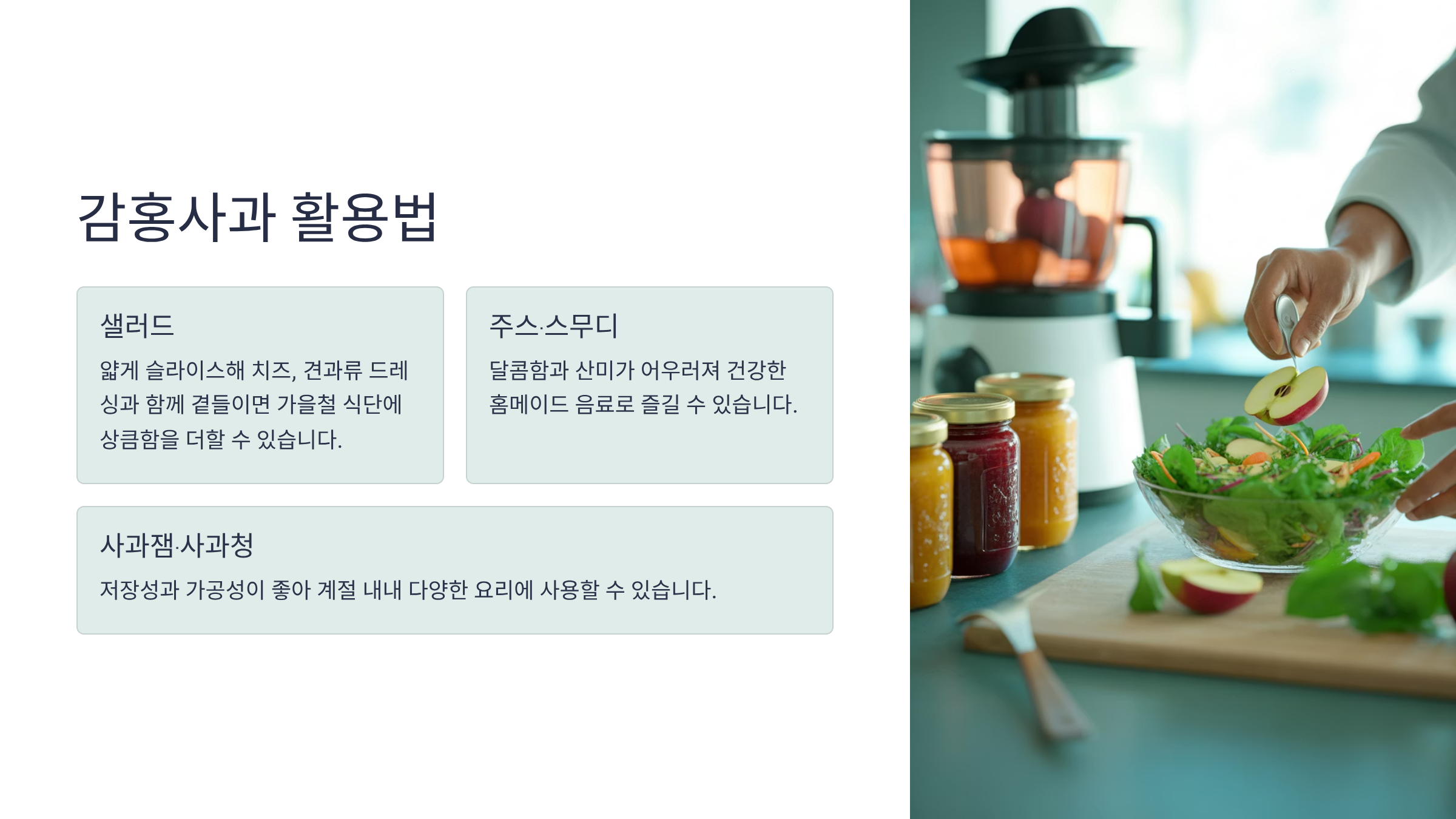 - 주스, 스무디: 감홍사과 특유의 달콤함과 산미가 어우러져 집에서 건강한 홈메이드 음료로 즐길 수 있습니다.