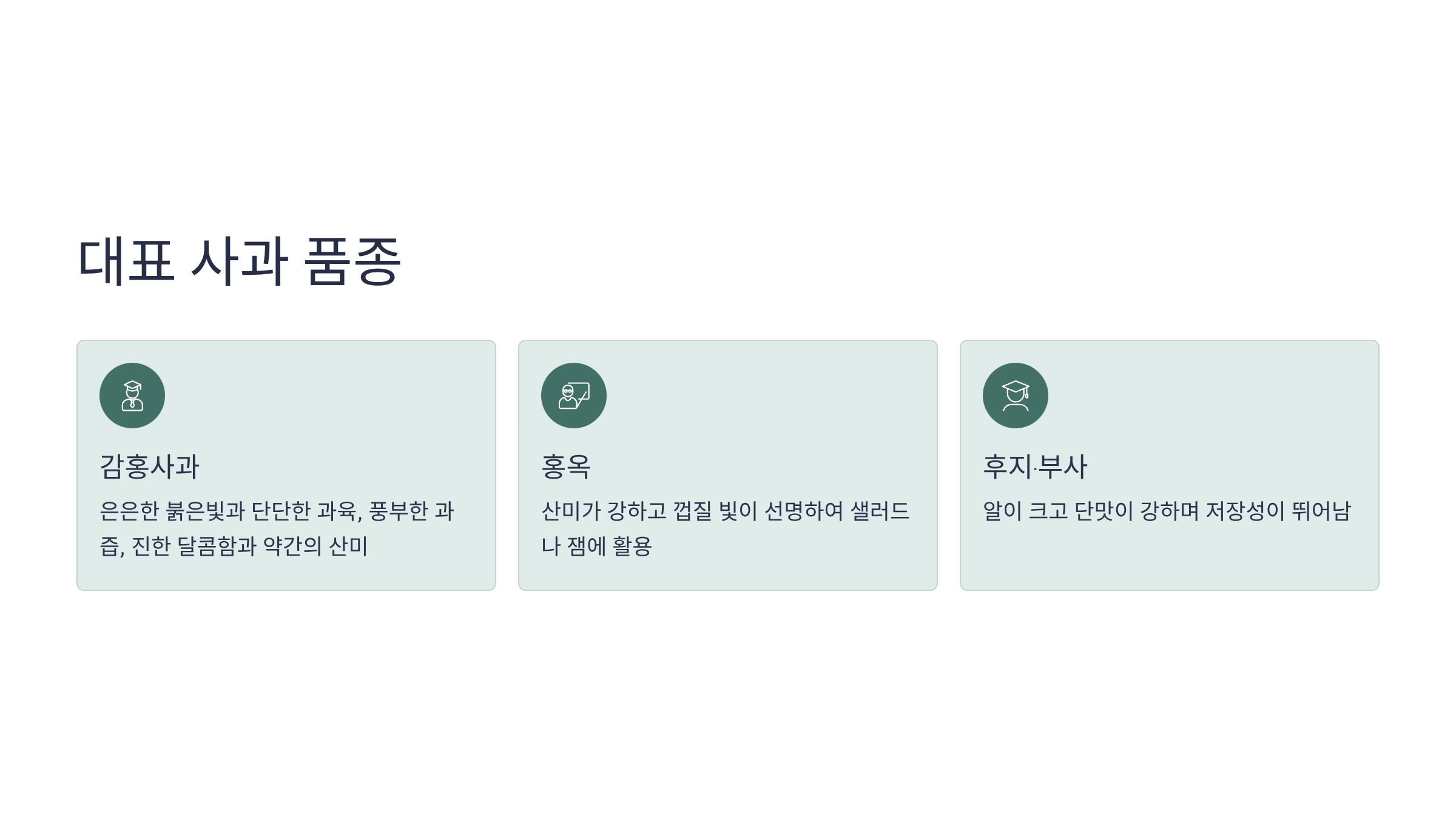 - 감홍사과: 은은한 붉은빛과 단단한 과육, 풍부한 과즙, 진한 달콤함과 약간의 산미가 특징입니다.