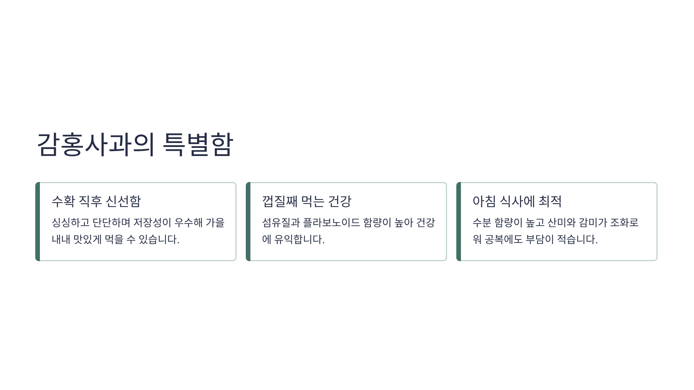 특히, 감홍사과는 수확 직후 싱싱하고 단단하며, 저장성이 우수해 가을 내내 맛있게 먹을 수 있습니다. 껍질째 먹을 경우 섬유질과 플라보노이드 함량이 높아 건강에도 유익합니다.