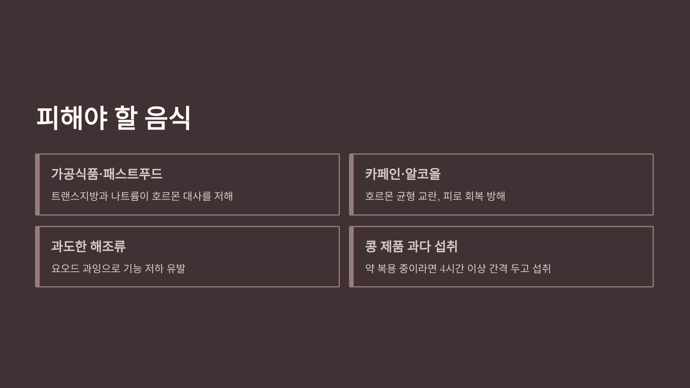 - 카페인·알코올: 호르몬 균형 교란, 피로 회복 방해