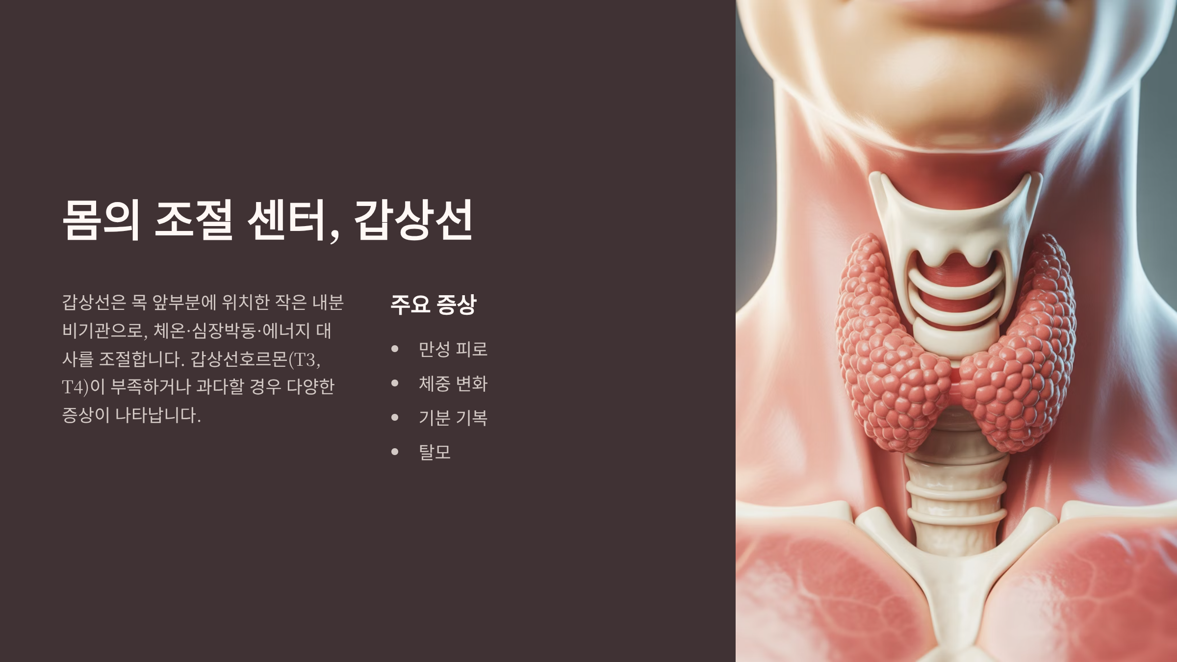 갑상선은 목 앞부분에 위치한 작은 내분비기관이지만, 체온·심장박동·에너지 대사를 조절하는 ‘몸의 조절 센터’입니다.