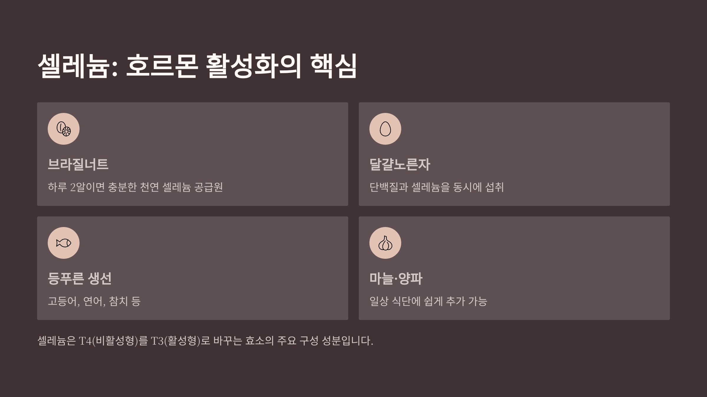 T4(비활성형 호르몬)를 T3(활성형)으로 바꾸는 효소의 주요 구성 성분이 바로 셀레늄입니다.