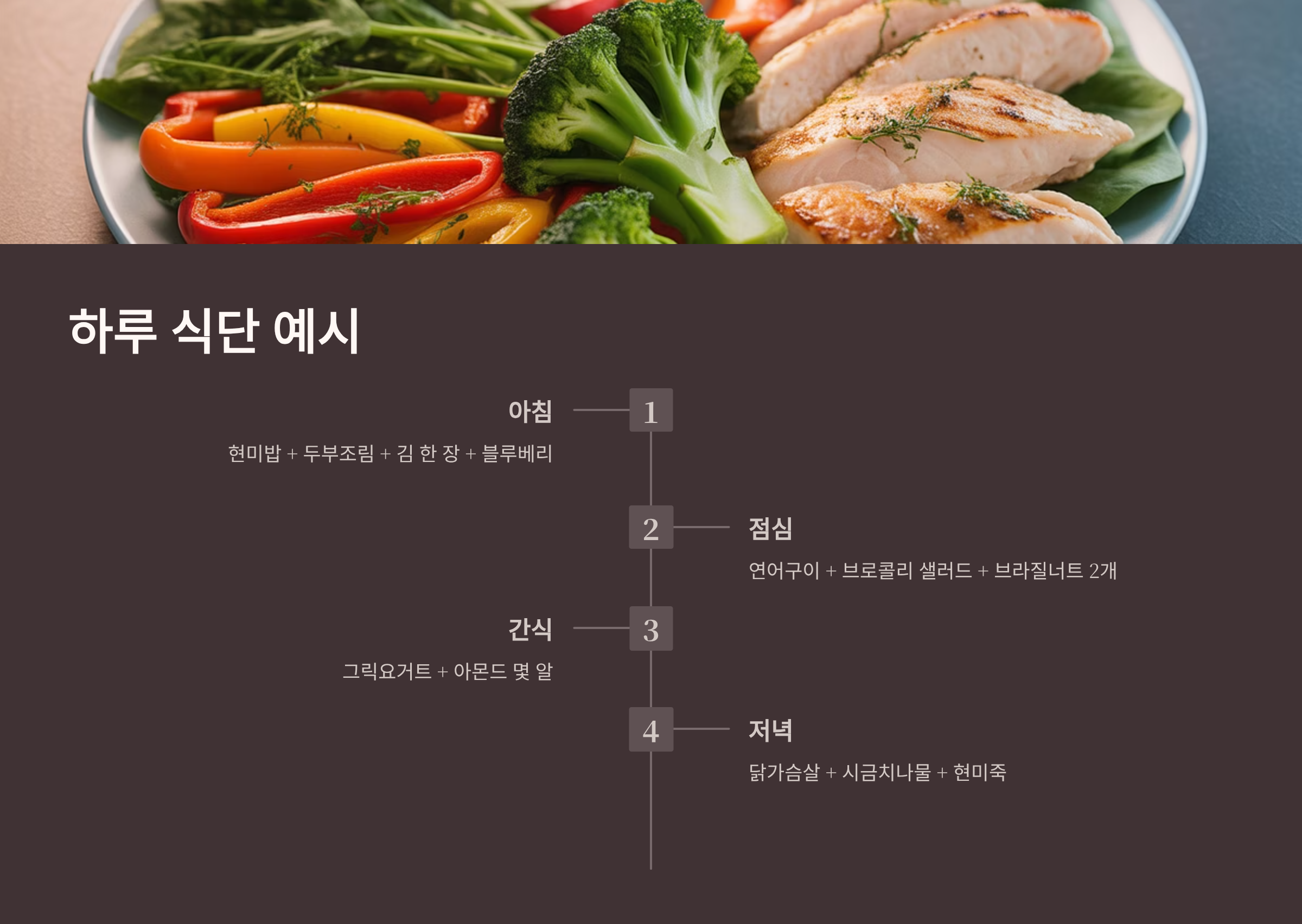 - 저녁: 닭가슴살 + 시금치나물 + 현미죽