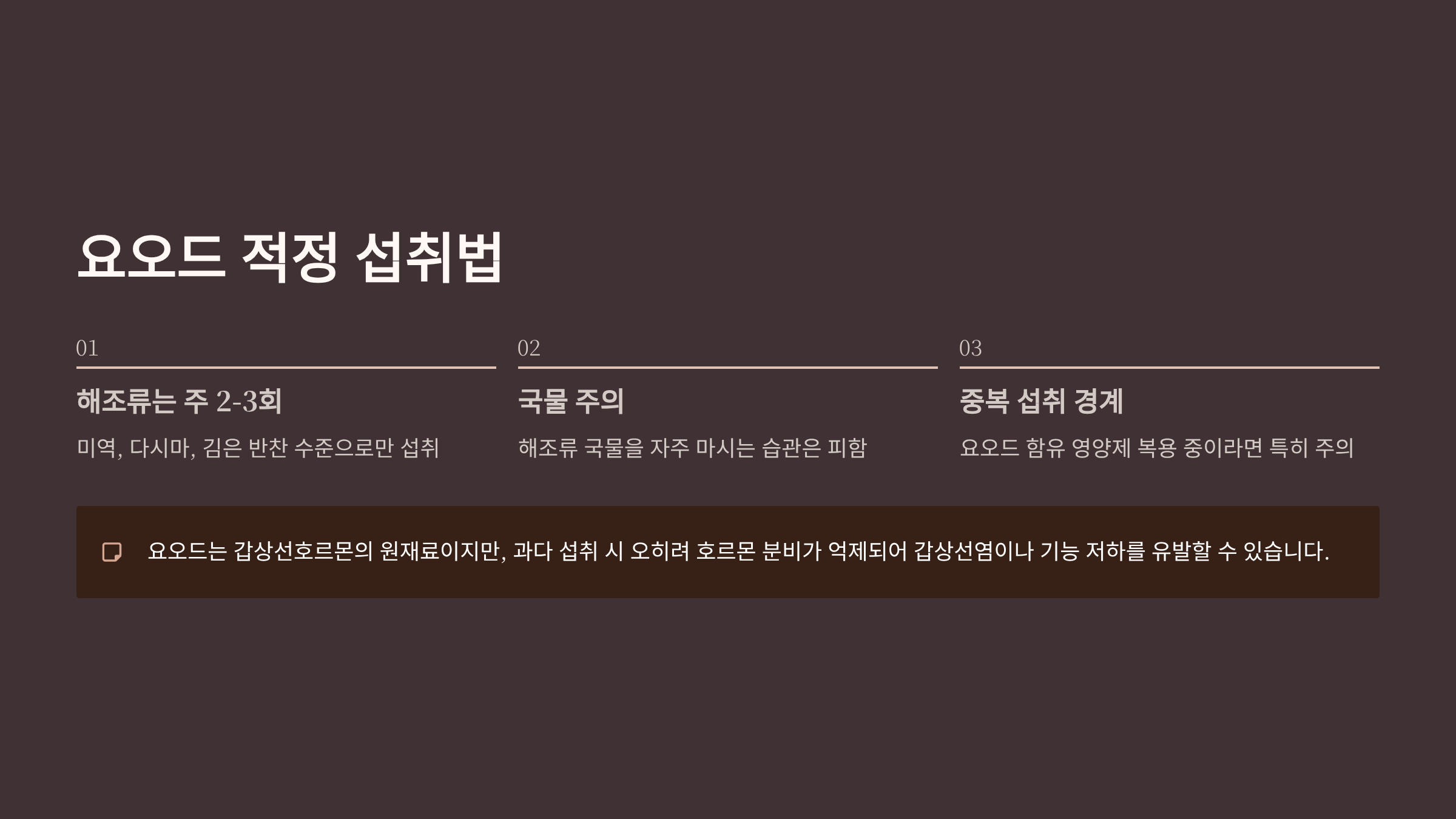 - 요오드 함유 영양제를 복용 중이라면 중복 섭취 주의