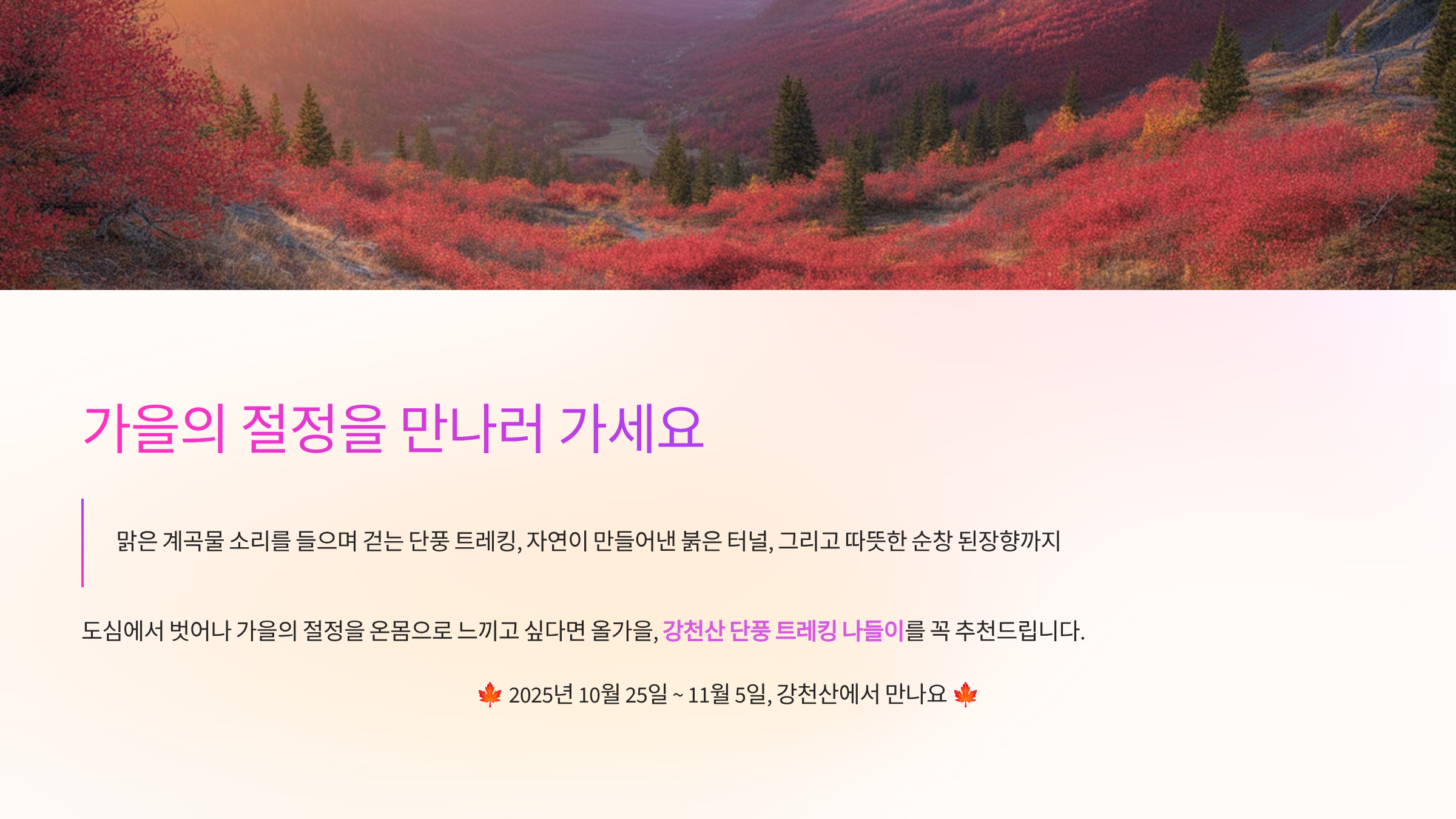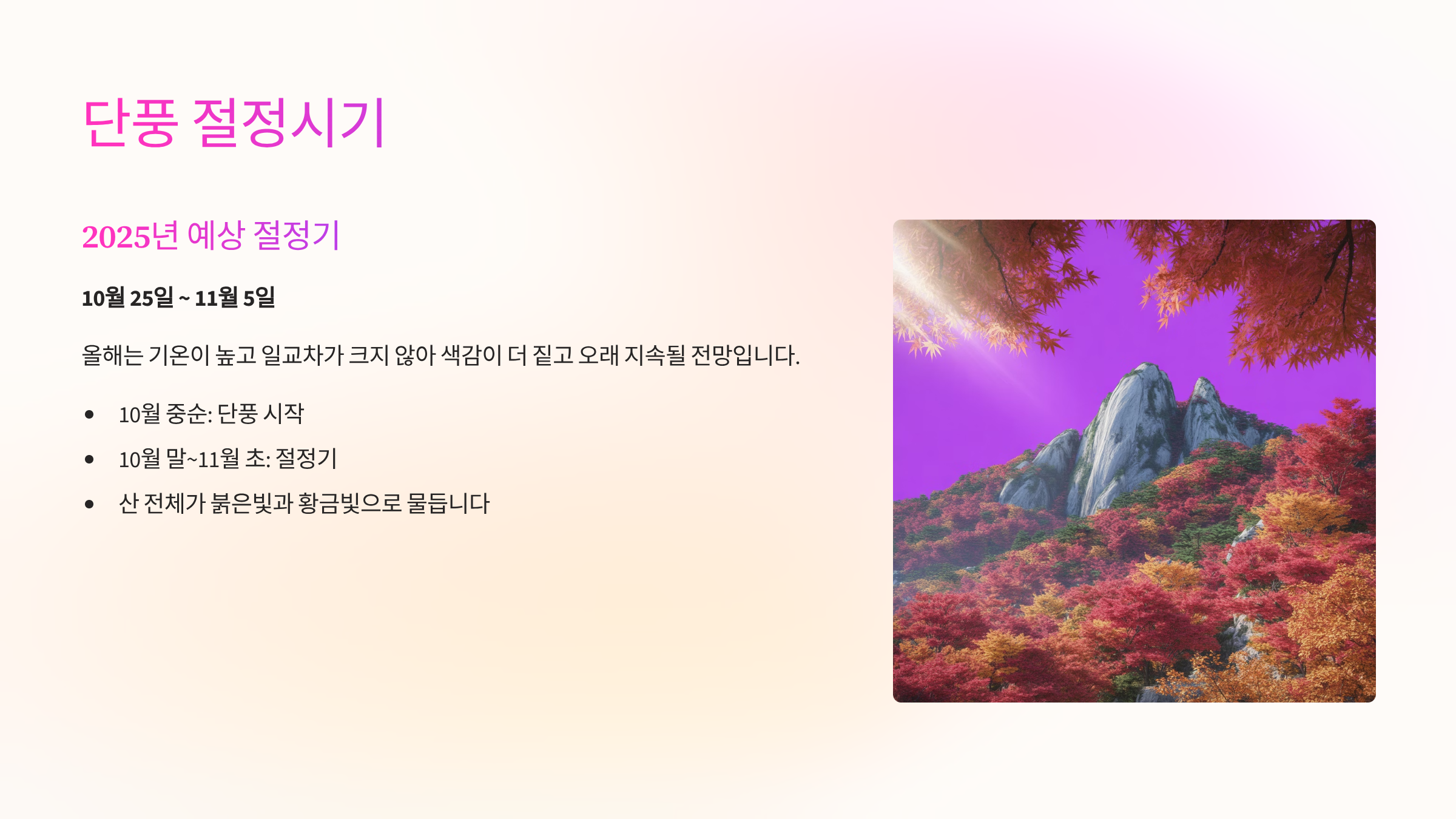 올해는 기온이 높고 일교차가 크지 않아, 색감이 더 짙고 오래 지속될 것으로 보입니다.