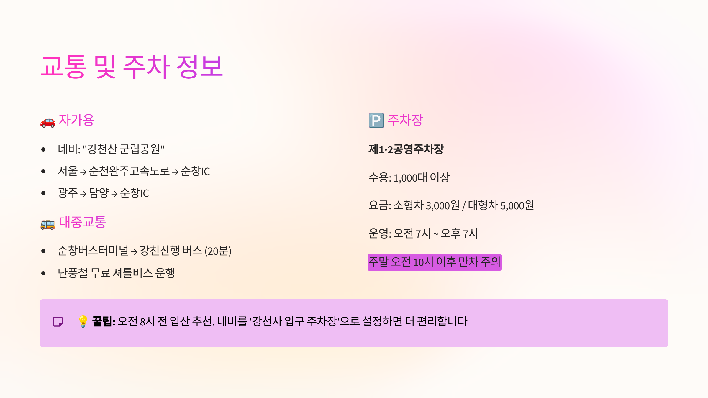 또한 순창군에서는 매년 단풍 절정기에 맞춰 순창 시내–강천산 간 무료 셔틀버스를 운행하니, 공식 홈페이지나 군청 공지사항을 미리 확인하면 좋아요.