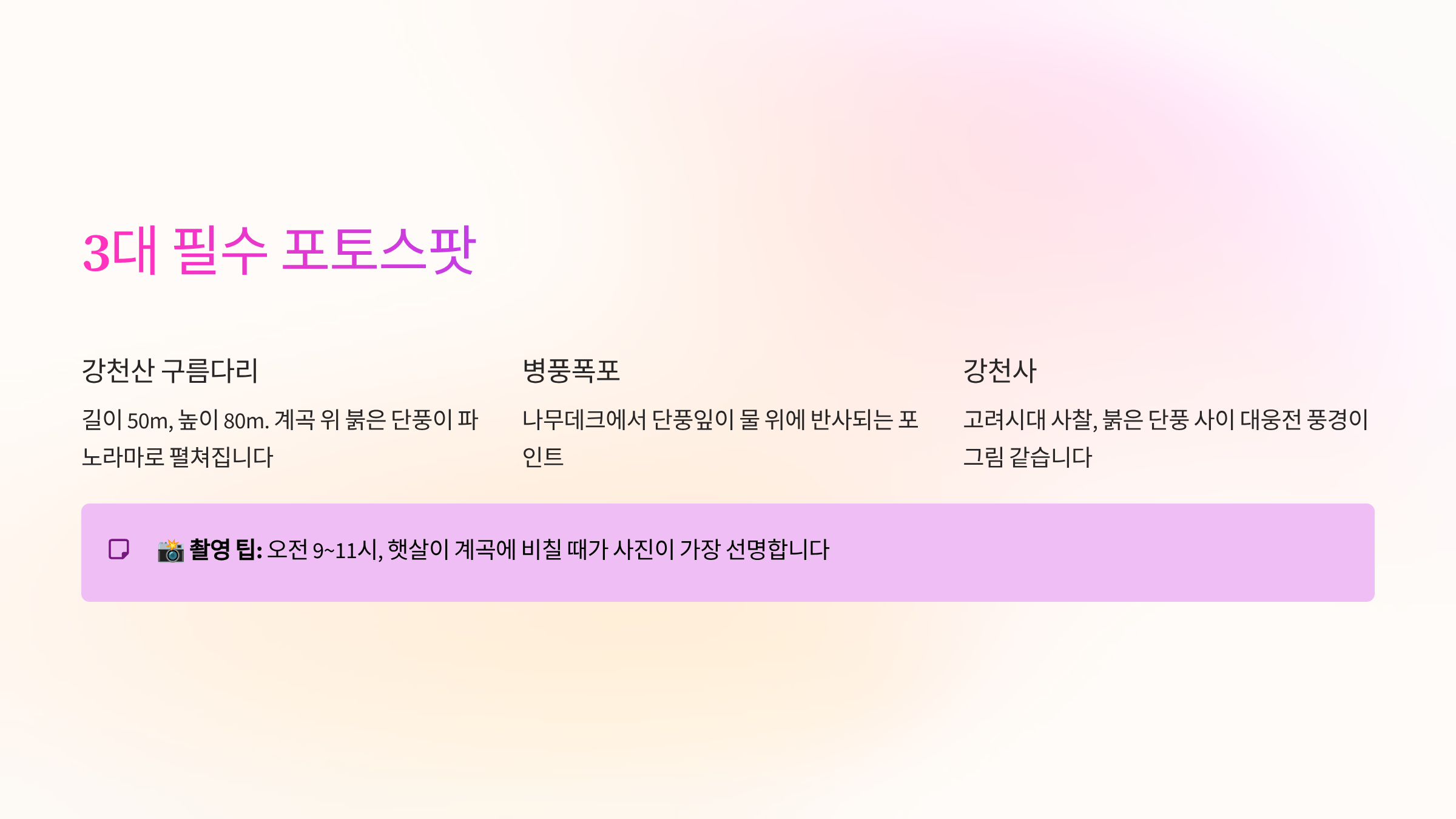 특히 대표 명소인 아래 세 곳이 유명하고 단풍이 절정일 때 붉은 숲길과 어우러져 포토스팟으로 인기가 많습니다.