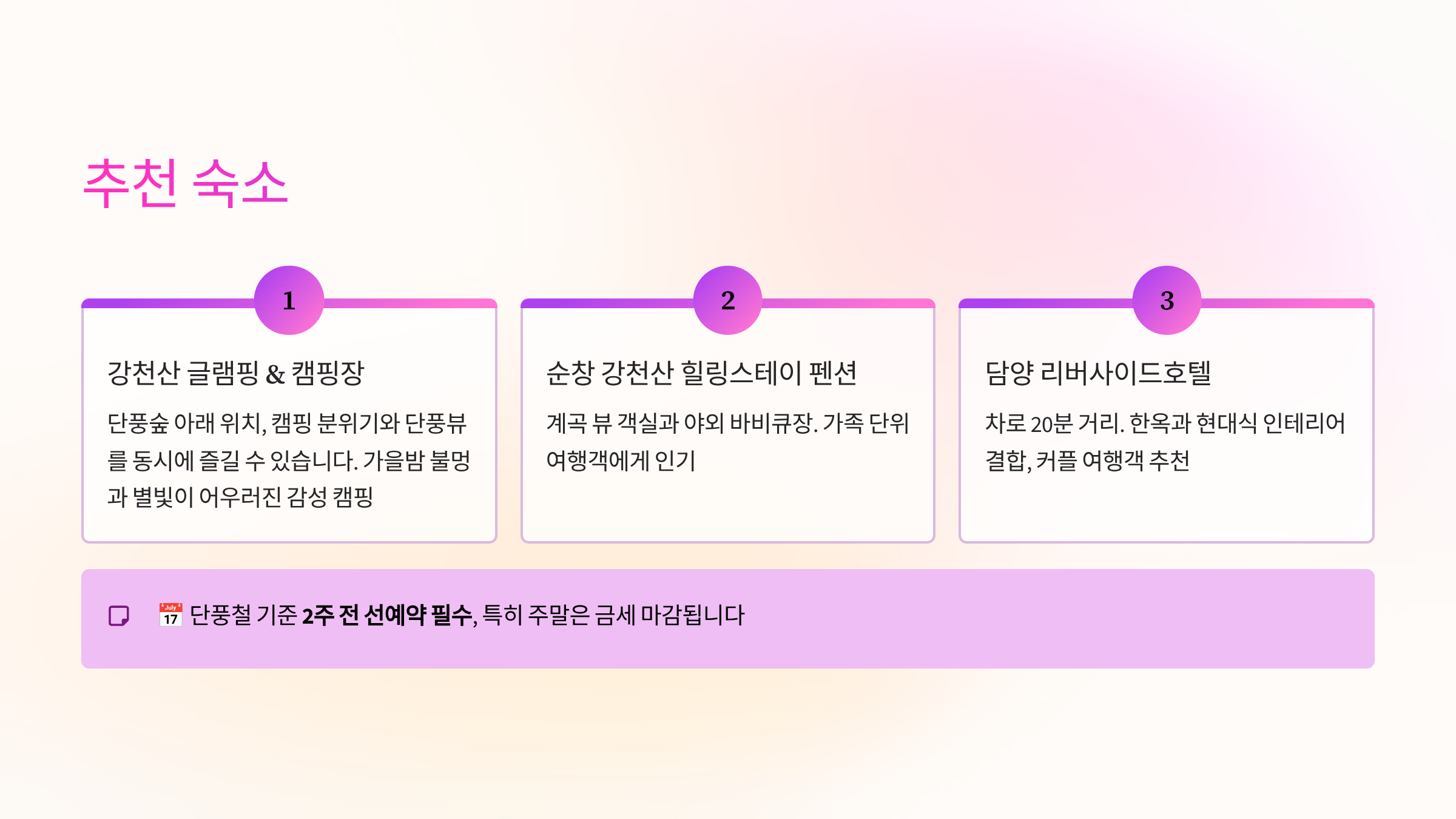 단풍 구경과 트레킹 후 여유롭게 1박 2일을 즐기고 싶다면 다음 숙소들을 추천드립니다.