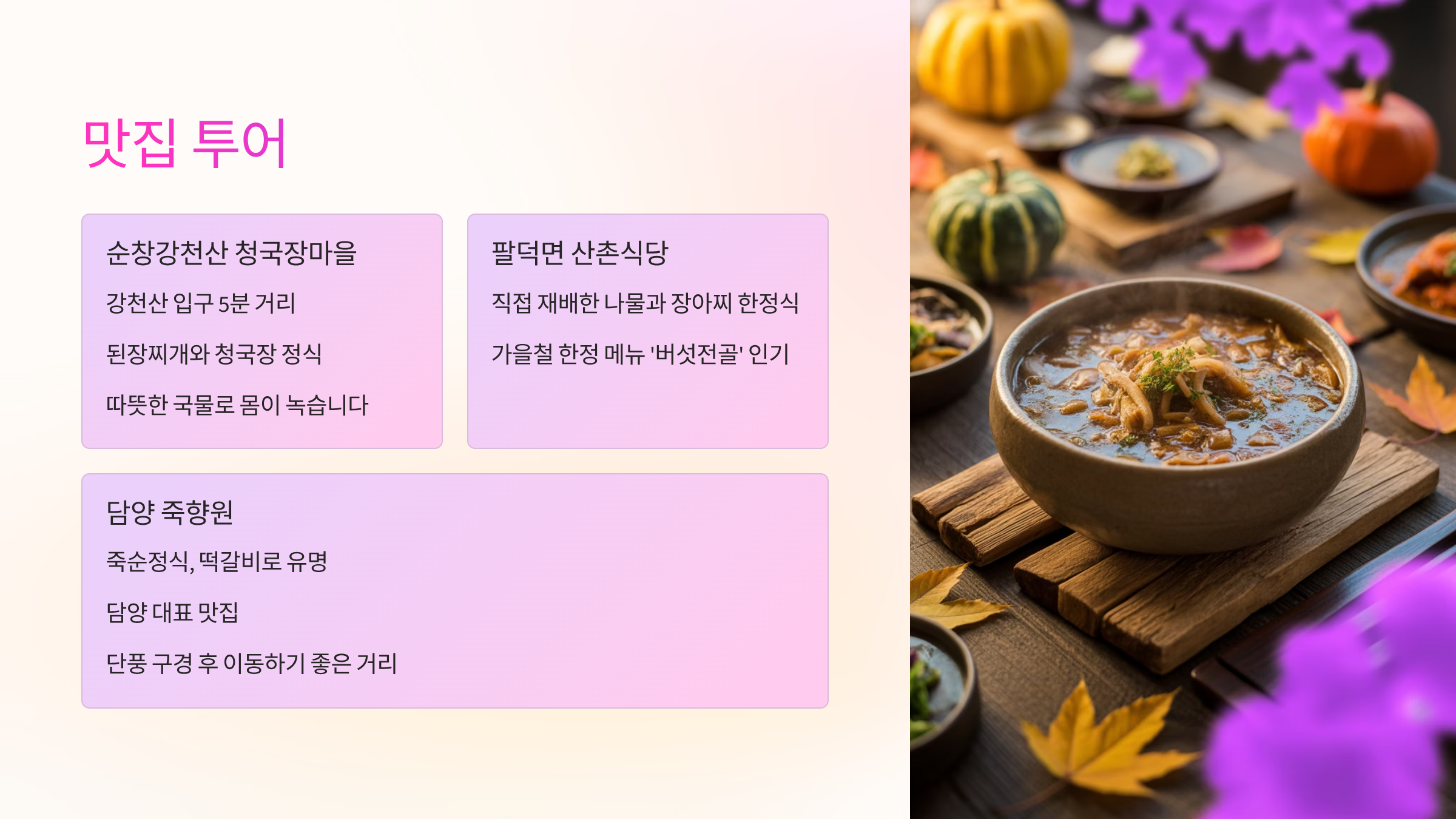 트레킹 후 허기진 배를 채워줄 순창·담양 맛집도 다양합니다.
