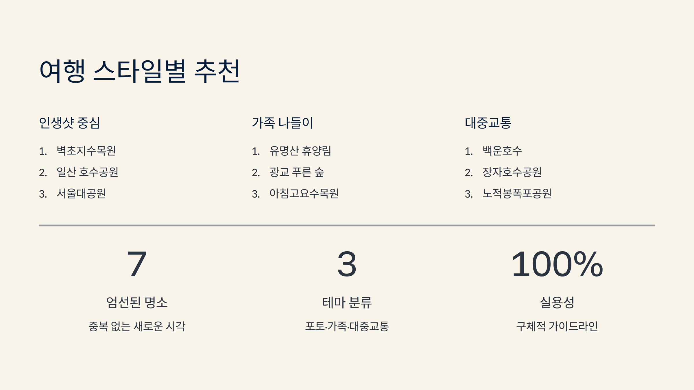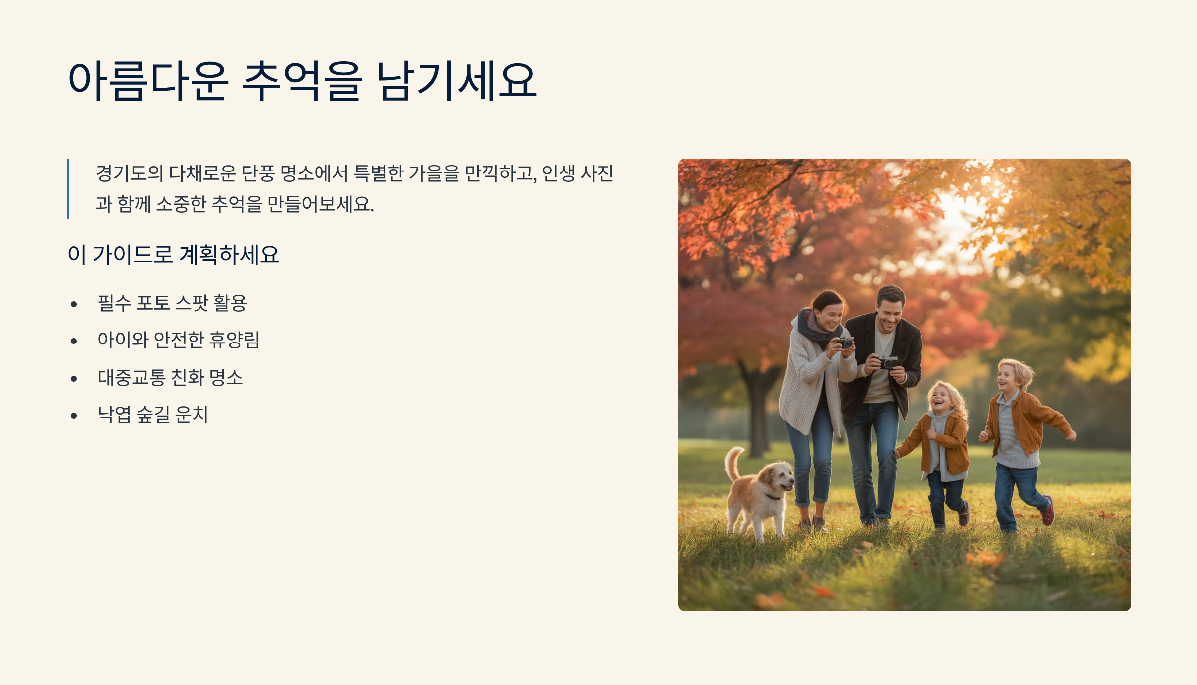 이 글은 기존 명소와 중복되지 않도록 새로운 시각으로 경기도 단풍구경 가볼만한 곳 7곳을 엄선하여 소개하고, 특히 '가을 인생샷'을 위한 최적의 포토 스팟 정보를 집중적으로 제공합니다. 아이와 함께 안전하게 즐길 수 있는 자연 휴양림과, 단풍 절정 후에도 운치 있는 낙엽길 숲길을 테마로 분석합니다. 또한, 자가용 없이도 지하철만으로 쉽게 갈 수 있는 대중교통 친화적인 단풍 명소를 추천하여 경기도 단풍 여행을 더욱 쉽게 계획할 수 있도록 돕습니다.