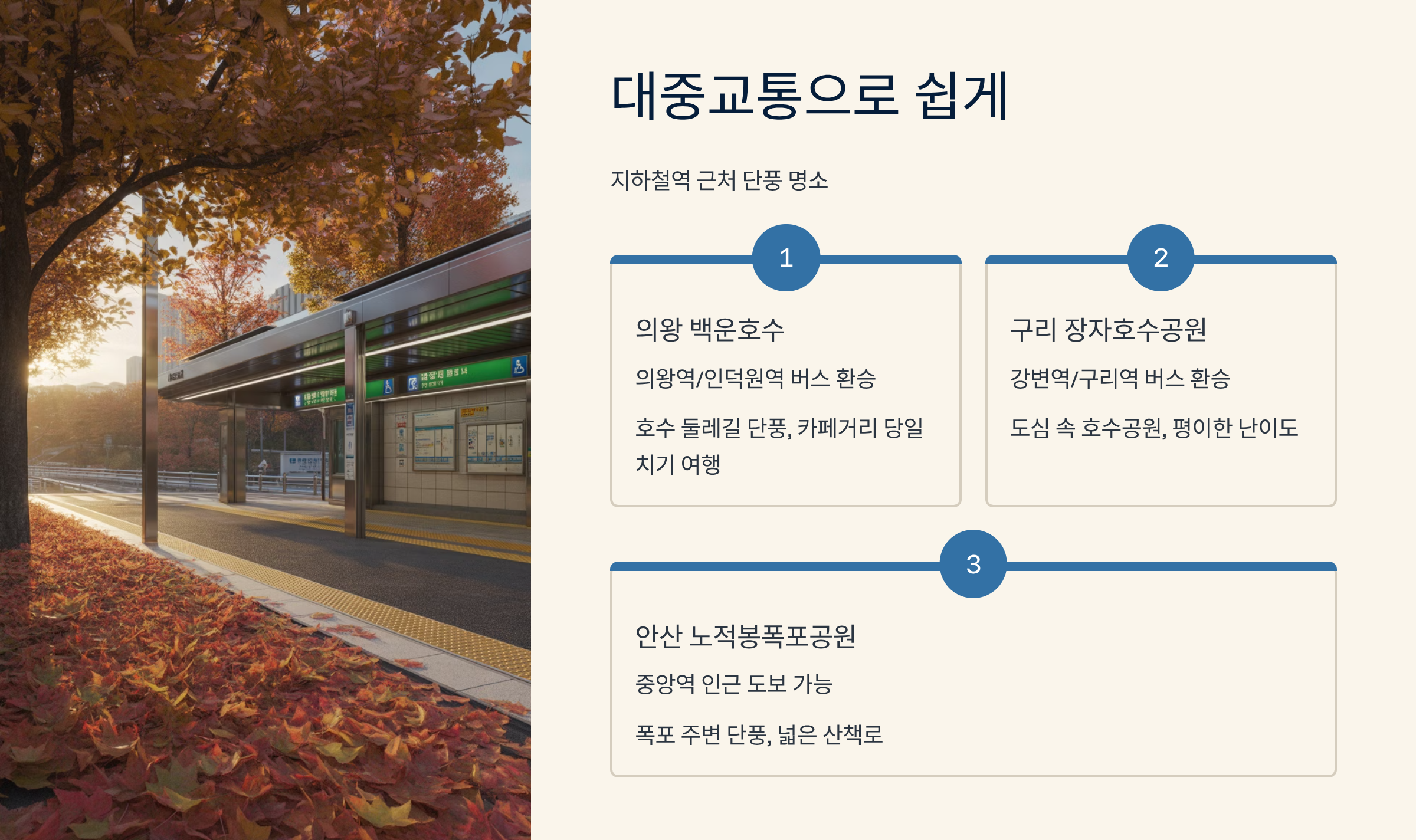 - 구리 장자호수공원 (강변역/구리역 인근 버스 환승): 도심 속에 위치한 호수공원으로, 주변 산책로를 따라 단풍이 아름답게 물듭니다. 대중교통 접근성이 좋고 난이도가 평이하여 가벼운 단풍 구경에 좋습니다.