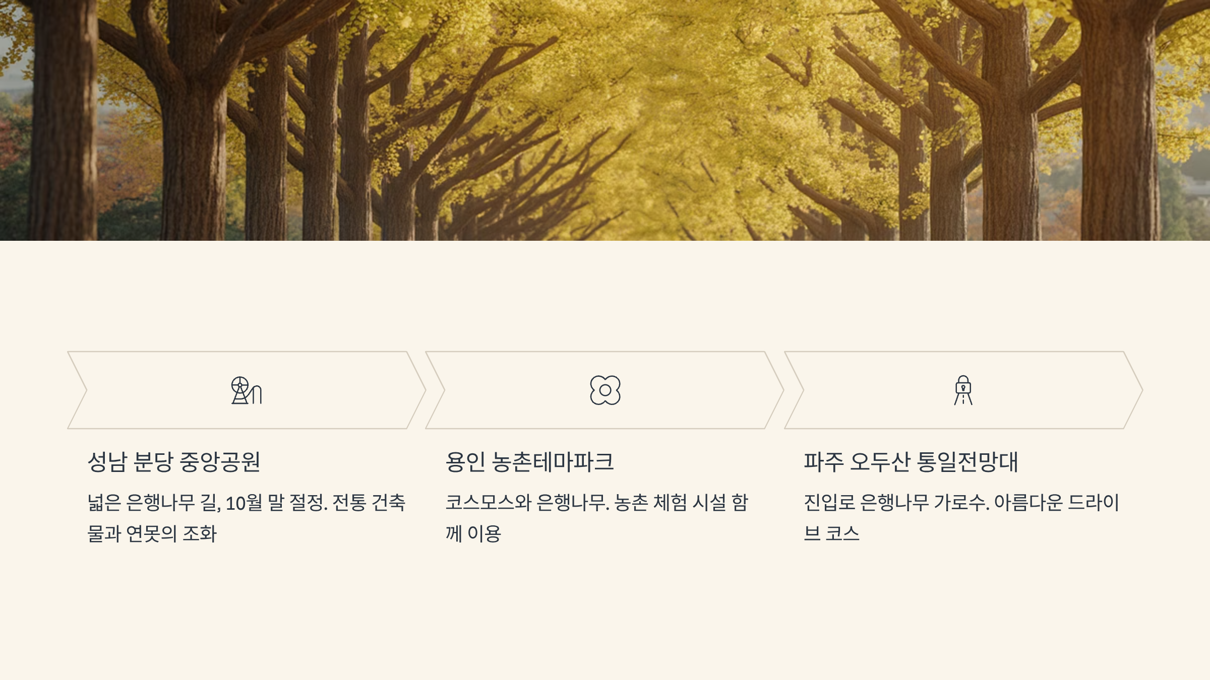 - 용인 농촌테마파크: 가을철 코스모스와 함께 노랗게 물든 은행나무를 볼 수 있는 곳입니다. 넓은 테마파크를 거닐며 다양한 가을꽃과 은행 단풍을 함께 즐길 수 있어 사진 찍기 좋으며, 농촌 체험 시설도 함께 이용할 수 있습니다.