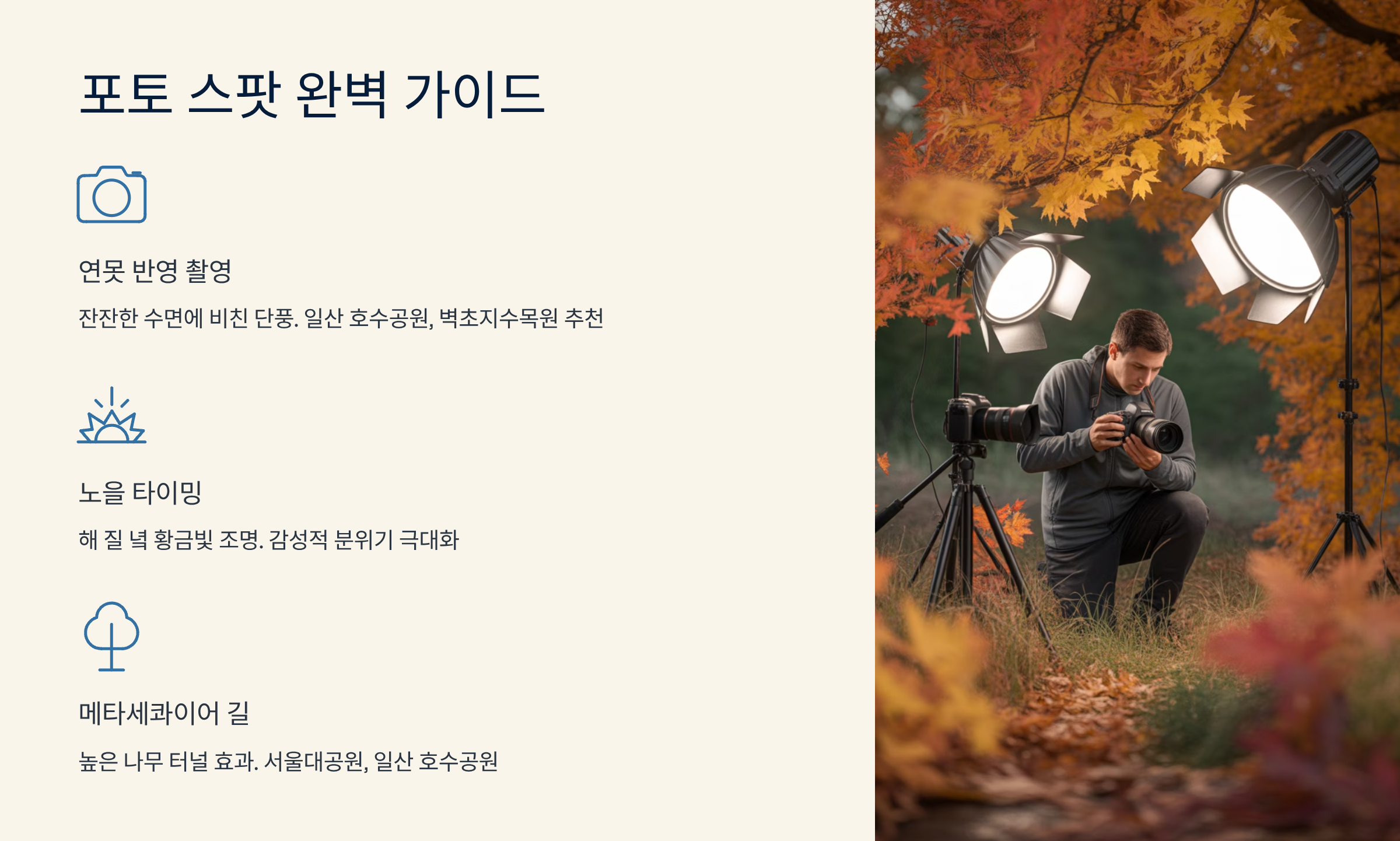 - 고양 일산 호수공원: 호수 주변으로 조성된 메타세콰이어와 단풍나무 길이 인상적입니다. 잔잔한 호수 수면에 비친 반영 단풍 사진이 필수 코스이며, 해 질 녘 노을과 단풍이 어우러진 풍경은 고요하고 감성적인 사진을 선사합니다.