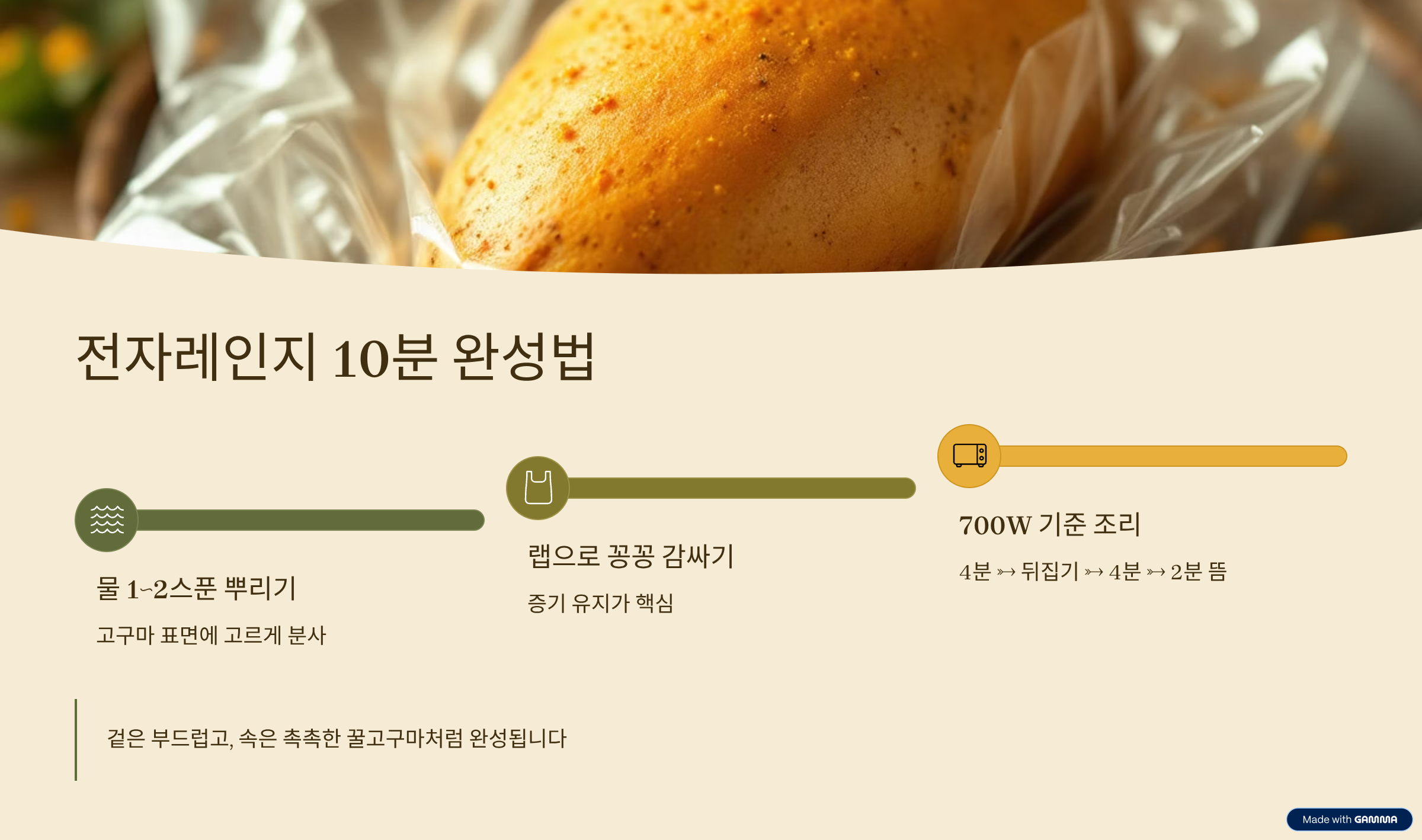 전자레인지를 사용할 때는 고구마+물 한 스푼+랩이 핵심입니다.