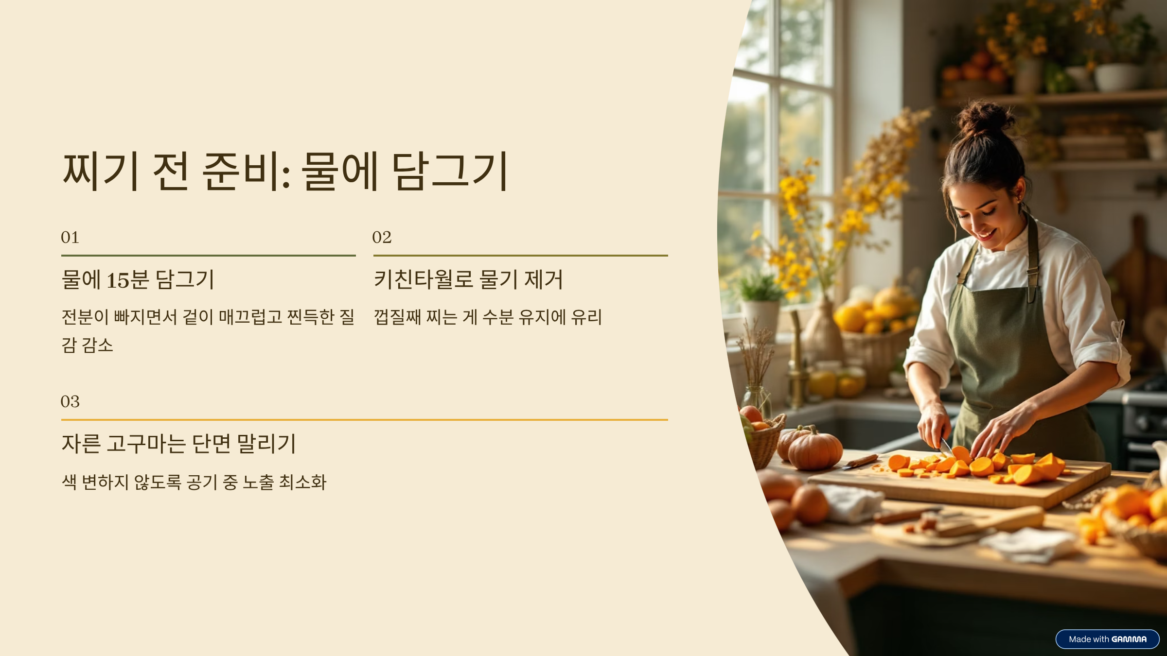 - 자른 고구마는 반드시 단면을 말려야 색 변하지 않음