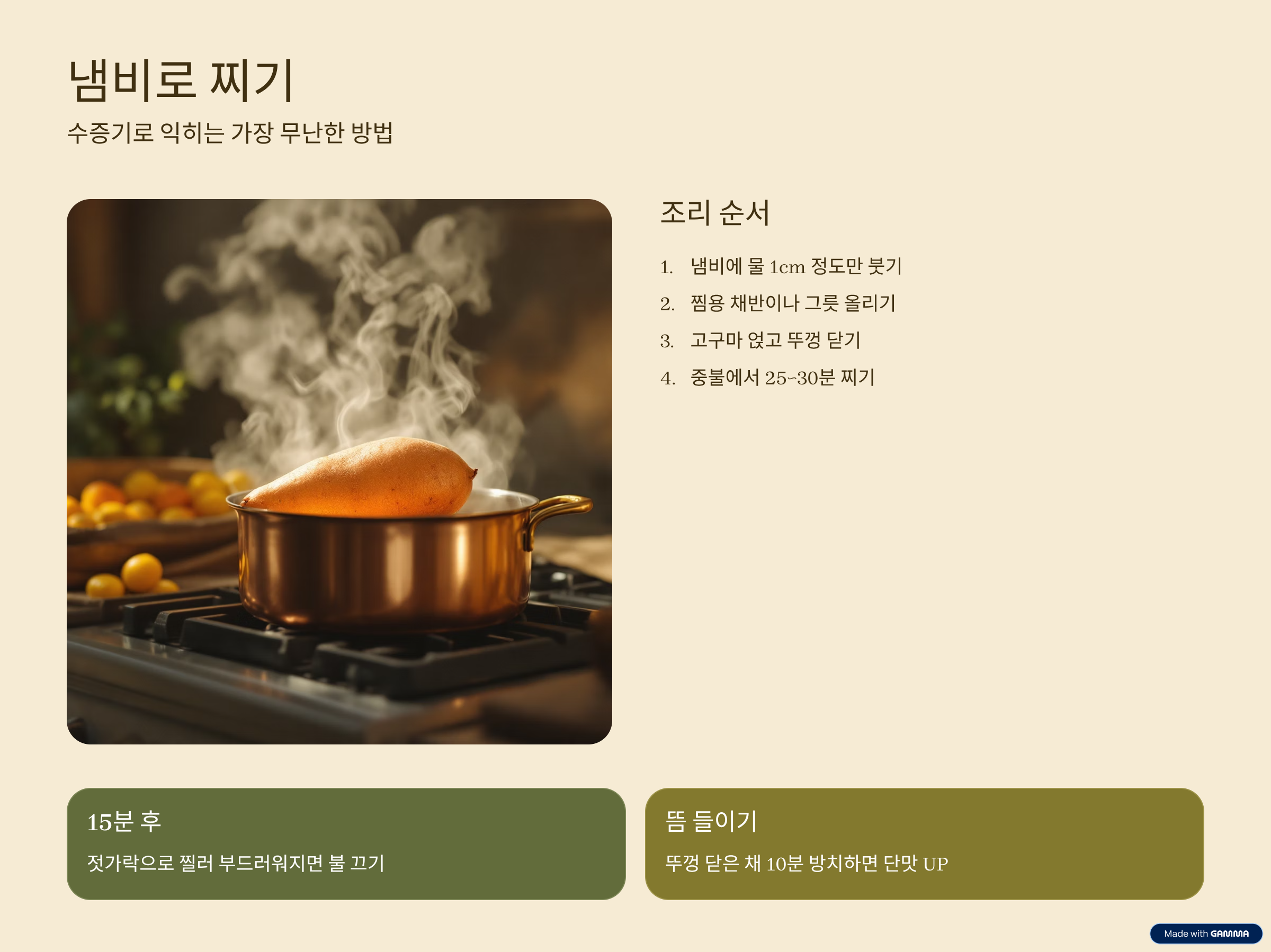 찌는 방법에 따라 단맛과 식감이 완전히 달라집니다.