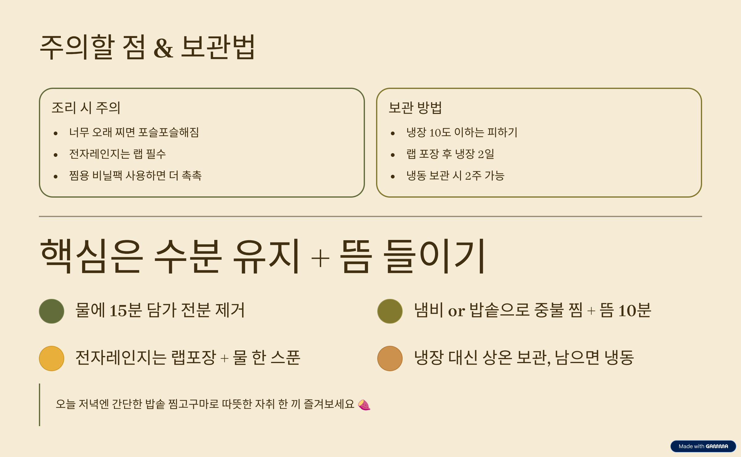 - 찐 고구마는 랩 포장 후 냉장 2일 / 냉동 2주 보관 가능.