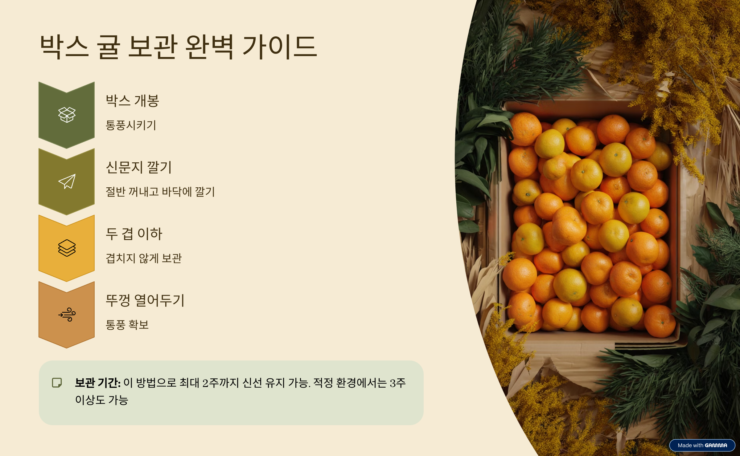 박스를 그대로 두면 아래쪽 귤이 먼저 물러지므로 반드시 다음과 같이 관리합니다.