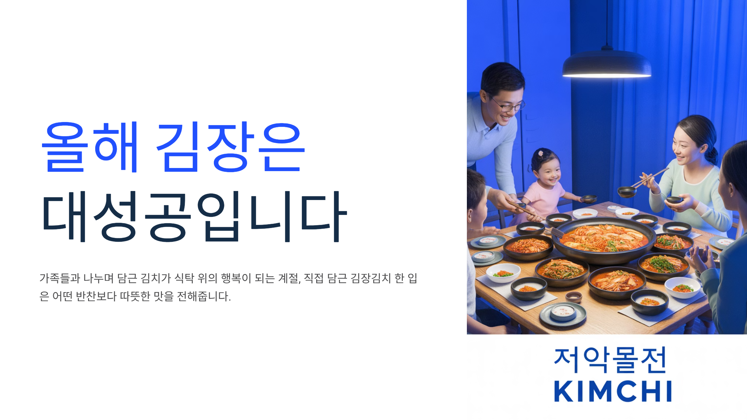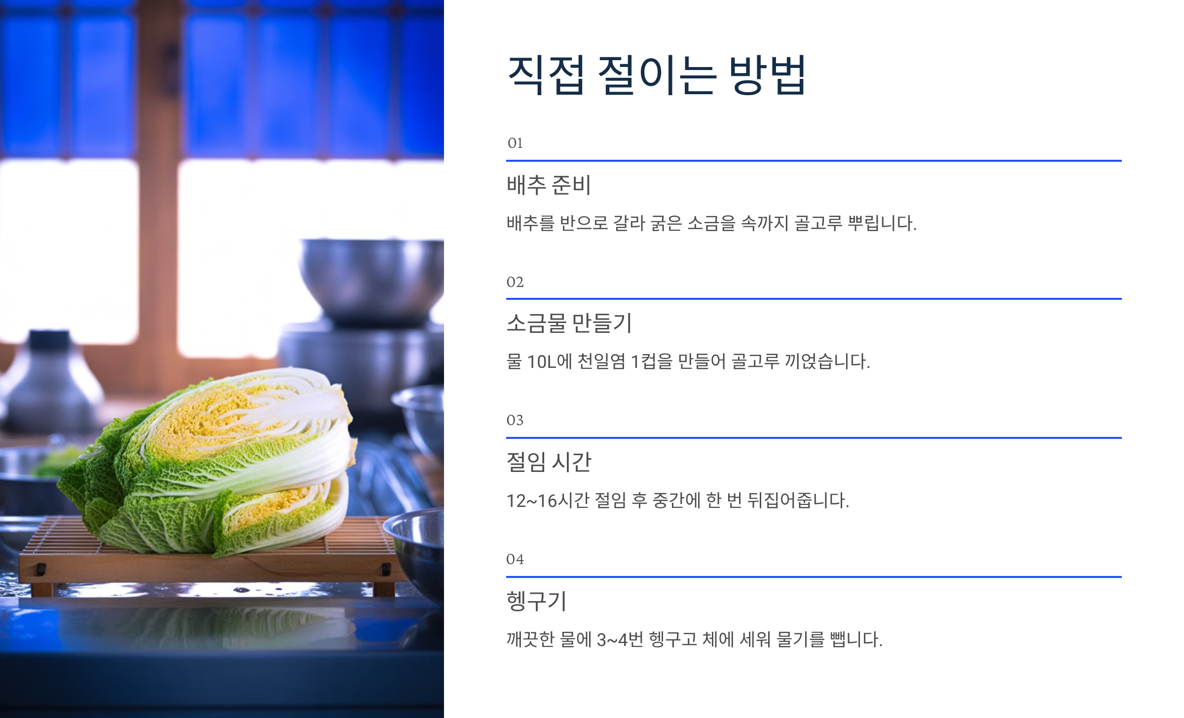 가족들과 나누며 담근 김치가 식탁 위의 행복이 되는 계절, 직접 담근 김장김치 한 입은 어떤 반찬보다 따뜻한 맛을 전해줍니다.