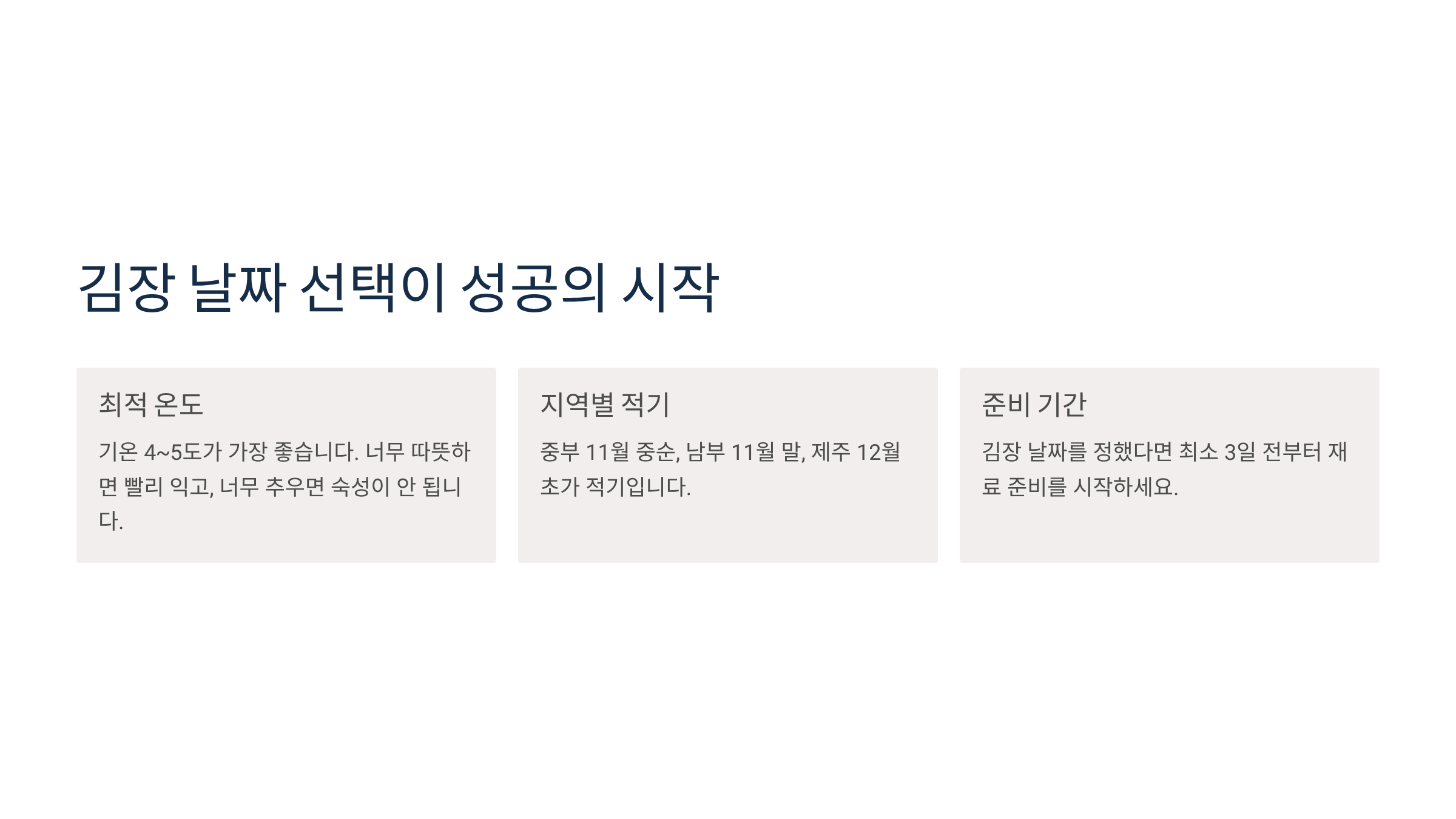 김장김치는 온도와 날씨에 따라 맛이 달라집니다. 일반적으로 기온이 4~5도 정도로 유지되는 시기가 가장 좋습니다. 너무 따뜻하면 김치가 빨리 익어 새콤해지고, 너무 추우면 속이 잘 숙성되지 않습니다.