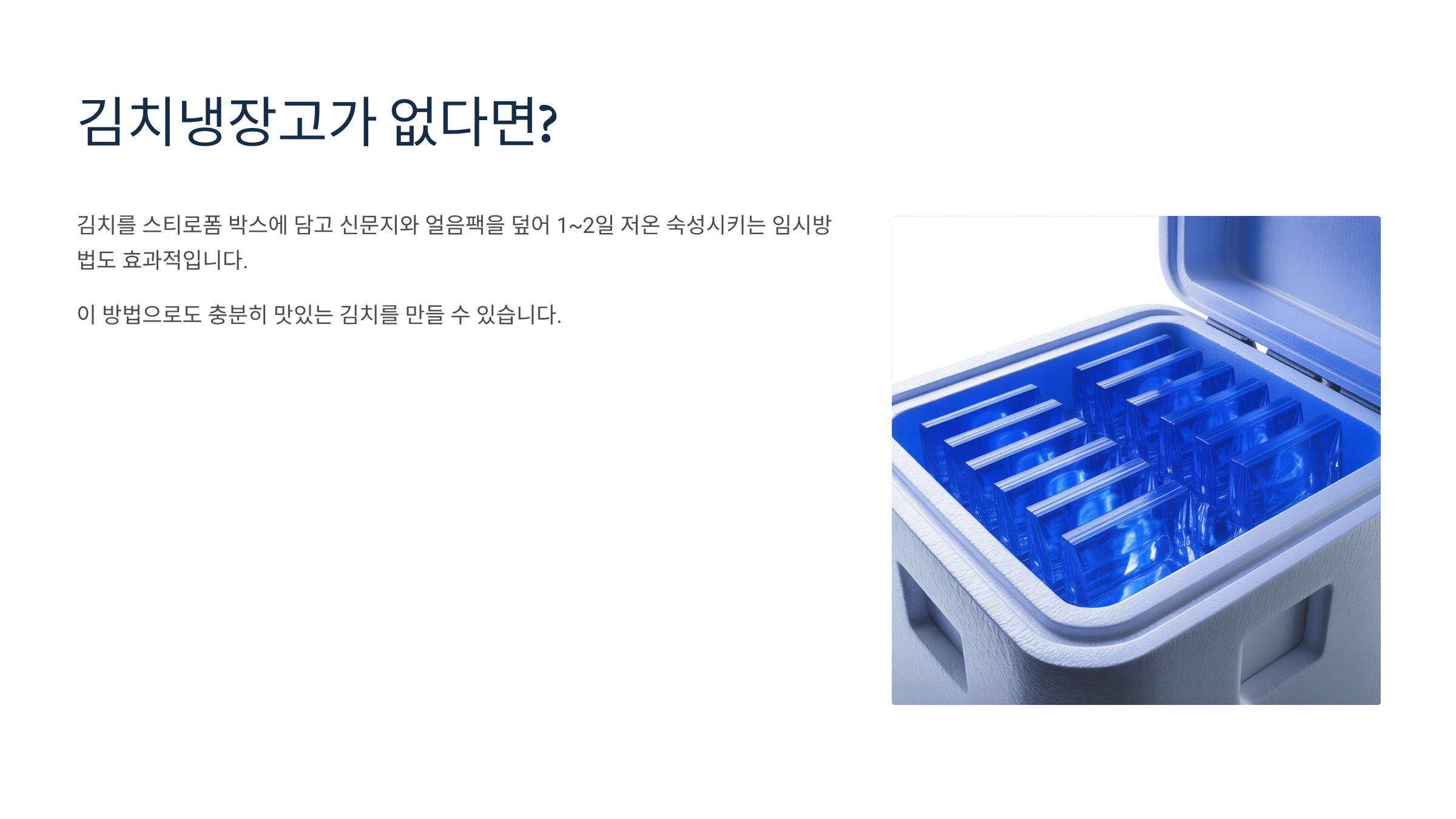 또한 김치 냉장고가 없다면, 김치를 스티로폼 박스에 담고 신문지와 얼음팩을 덮어 1~2일 저온 숙성시키는 임시방법도 효과적입니다.