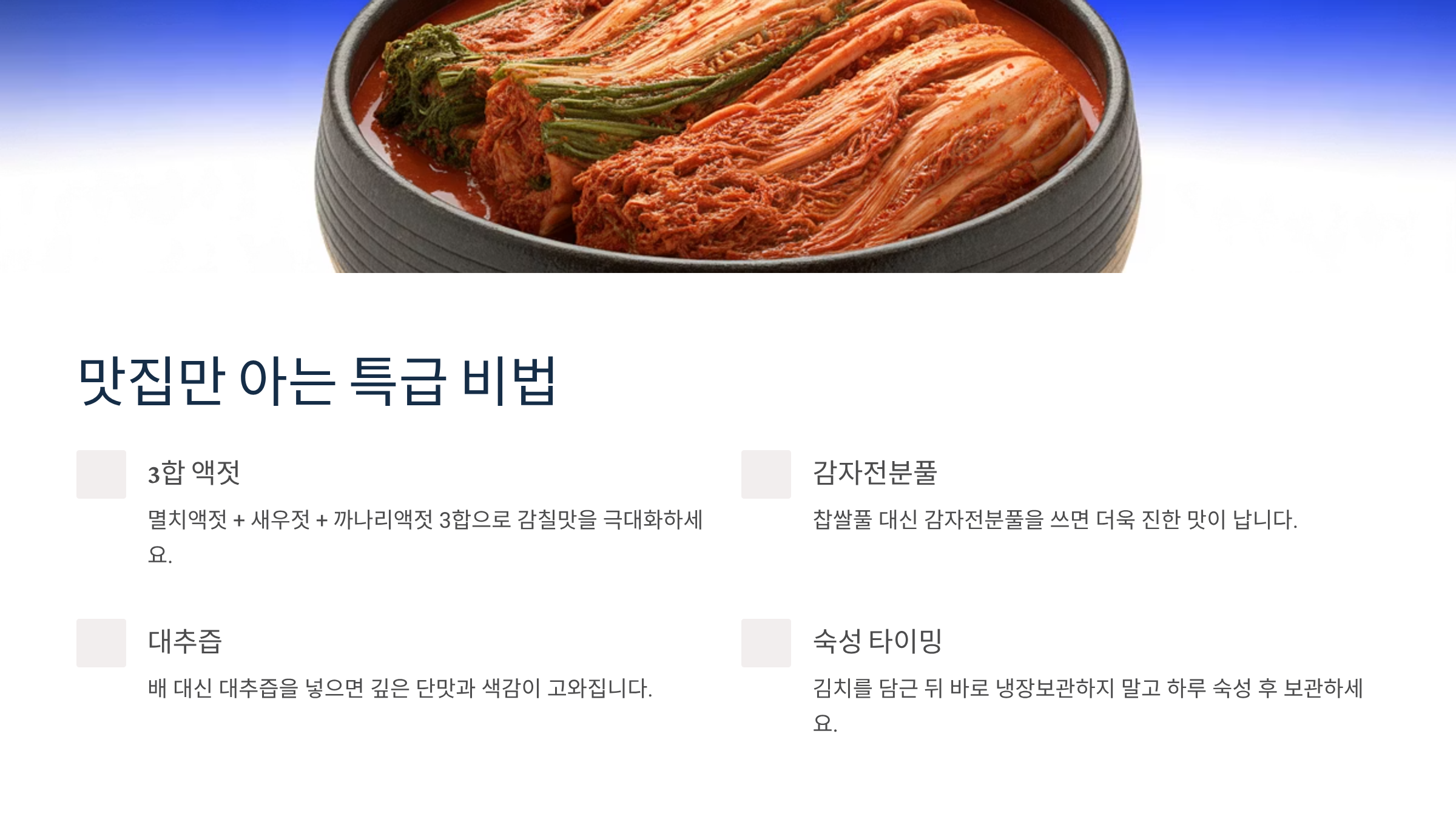- 멸치액젓 + 새우젓 + 까나리액젓 3합으로 감칠맛을 극대화