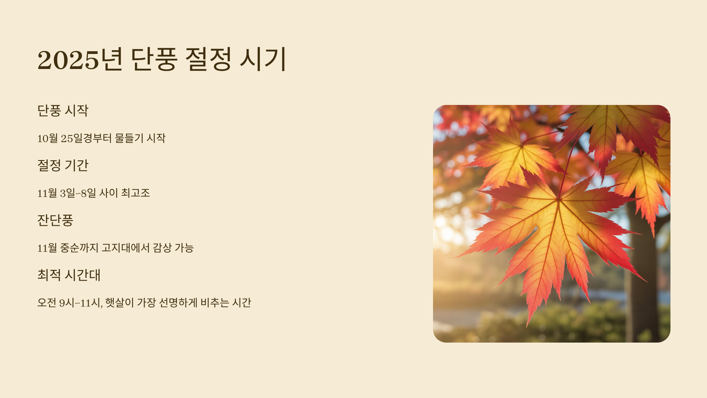 단풍 색감은 오전 햇살이 드는 9시~11시 사이가 가장 선명합니다.