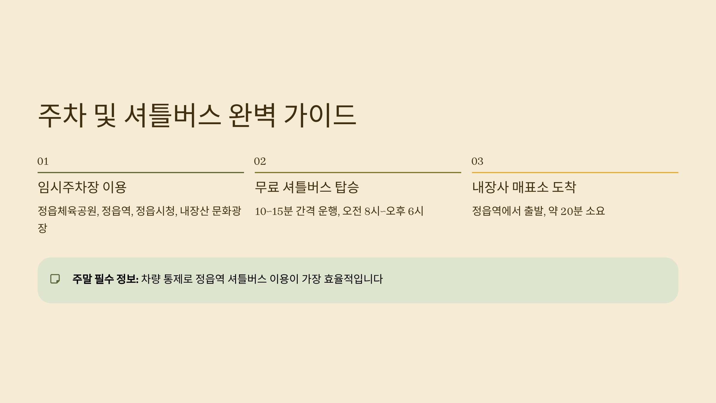 특히 주말에는 차량 통제가 이뤄지므로 정읍역 셔틀버스 이용이 가장 효율적입니다.