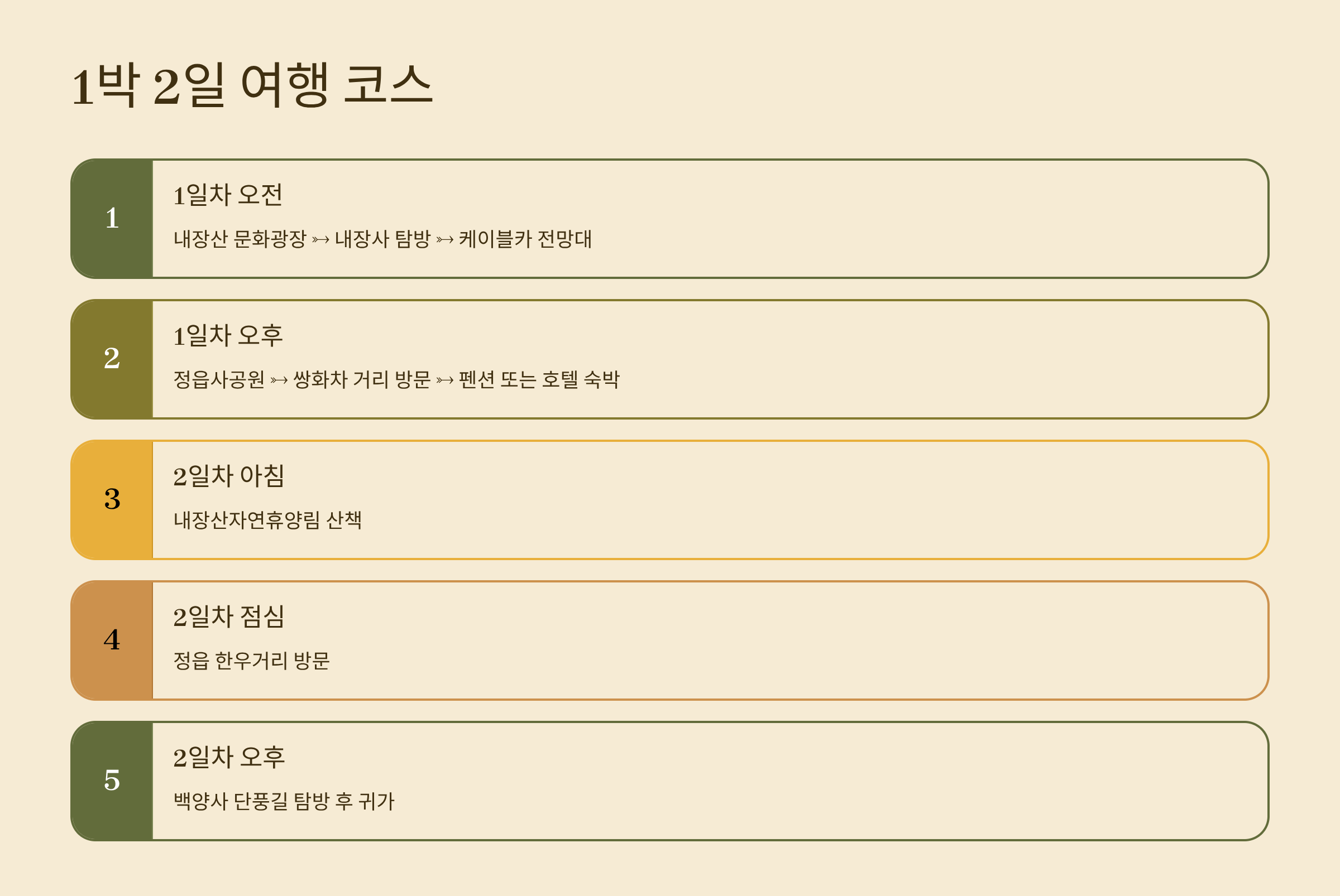 1박 2일 일정으로는 정읍 시내 숙박 후 주변 관광지를 함께 즐기는 구성을 추천합니다.