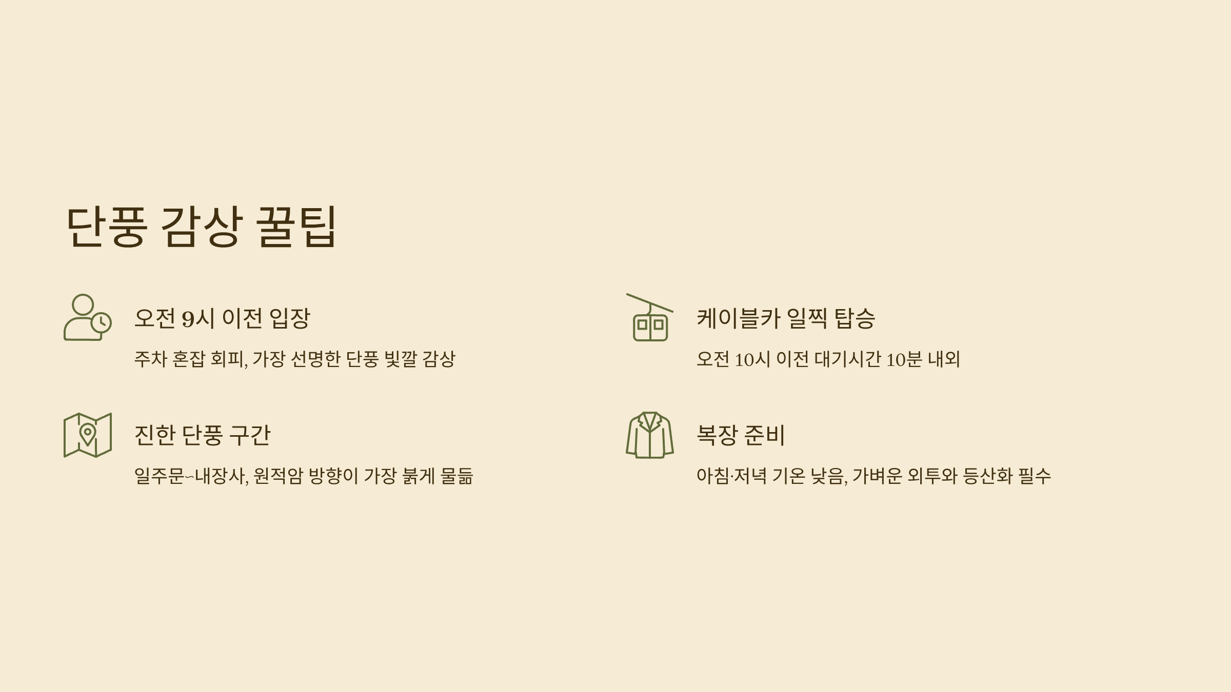주차 혼잡을 피하고 단풍 빛깔이 가장 선명할 때 감상 가능합니다. - 케이블카 탑승 대기 최소화