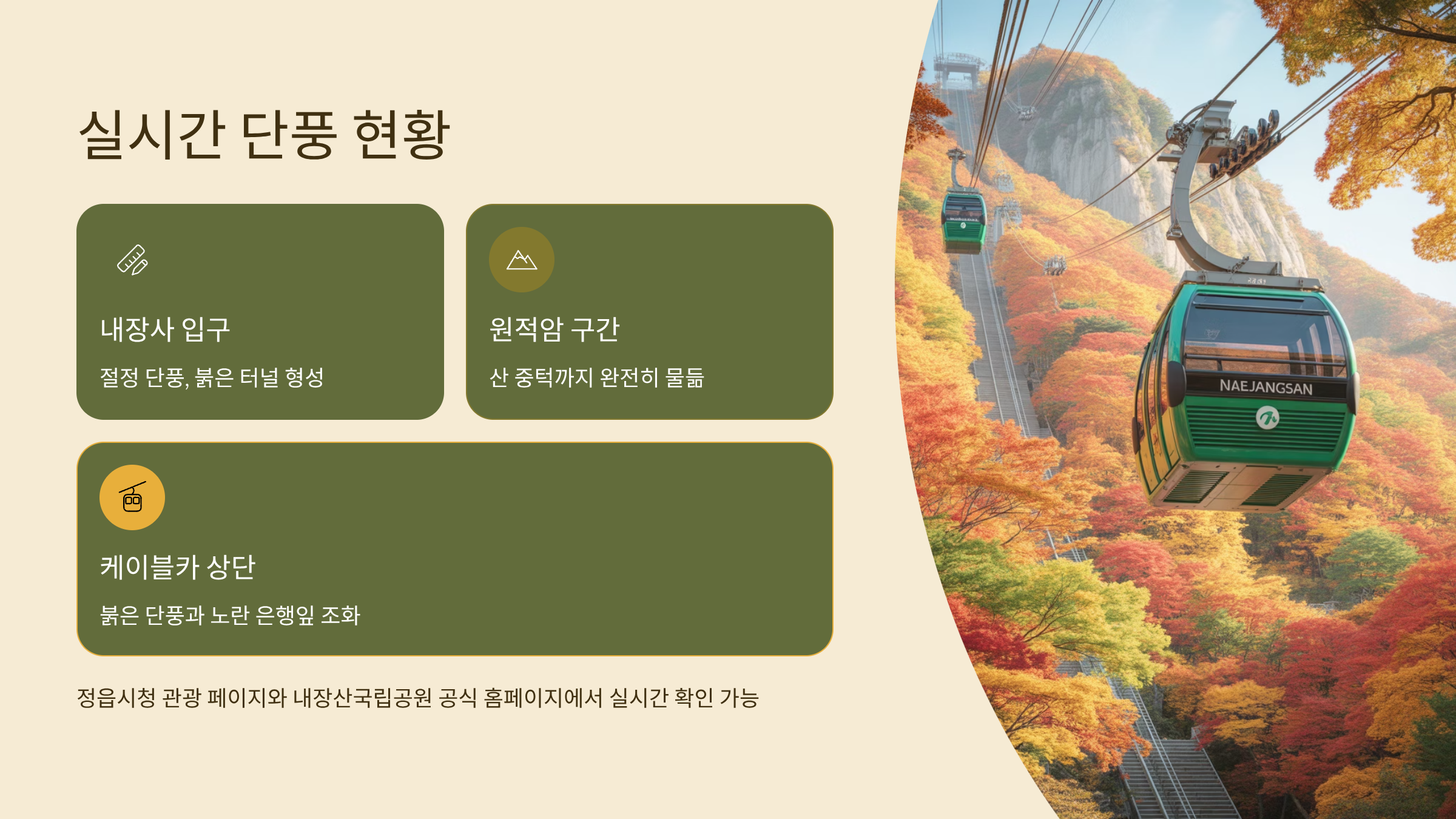 실시간 단풍현황은 정읍시청 관광 페이지 또는 내장산국립공원 공식 홈페이지를 통해 확인할 수 있습니다.