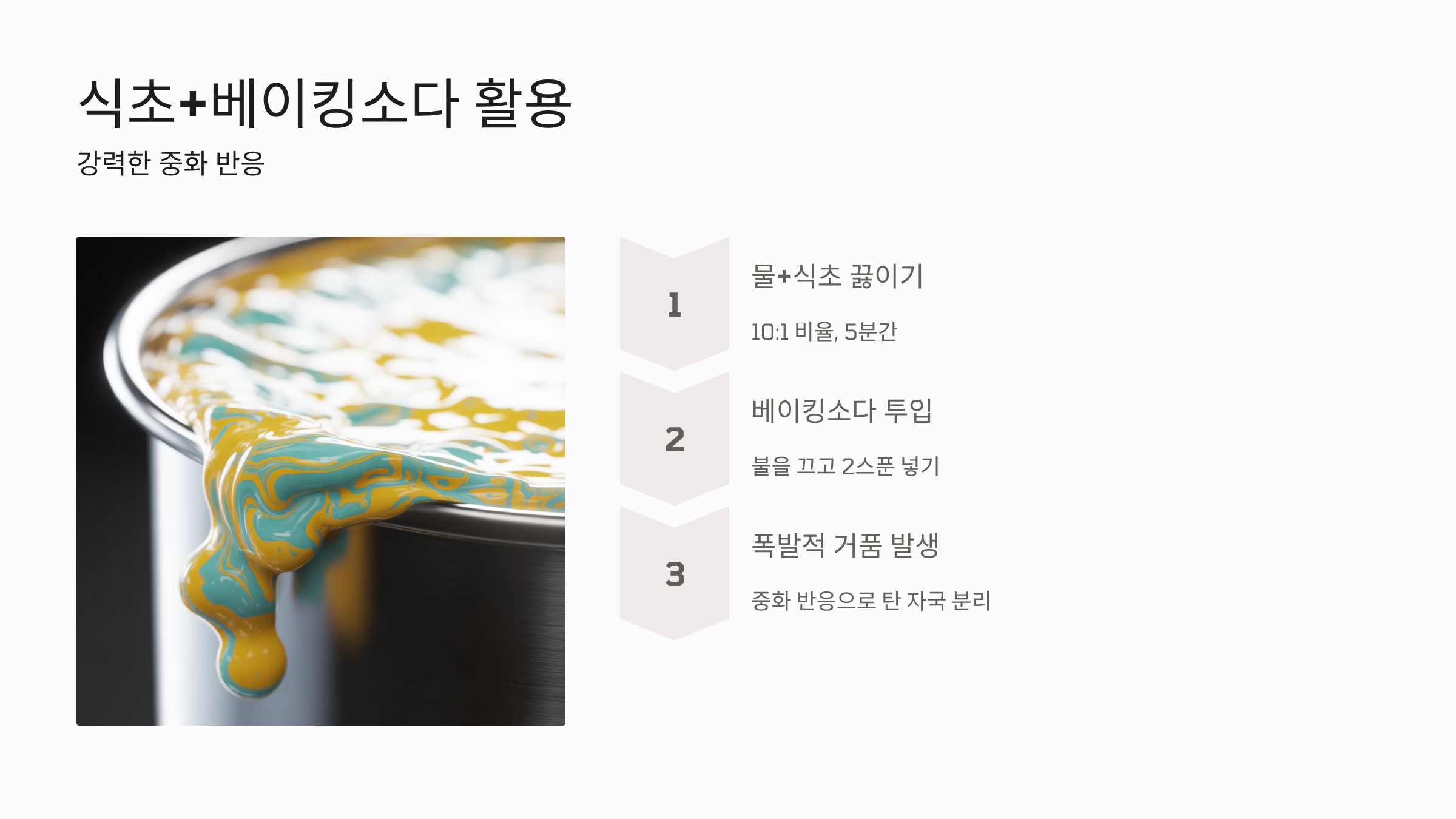 - 불을 끄고 베이킹소다 2스푼을 넣습니다. 산성과 염기성이 만나 폭발적인 거품이 발생(중화 반응)하며, 이 물리적 힘이 찌든 탄 자국을 밀어냅니다.