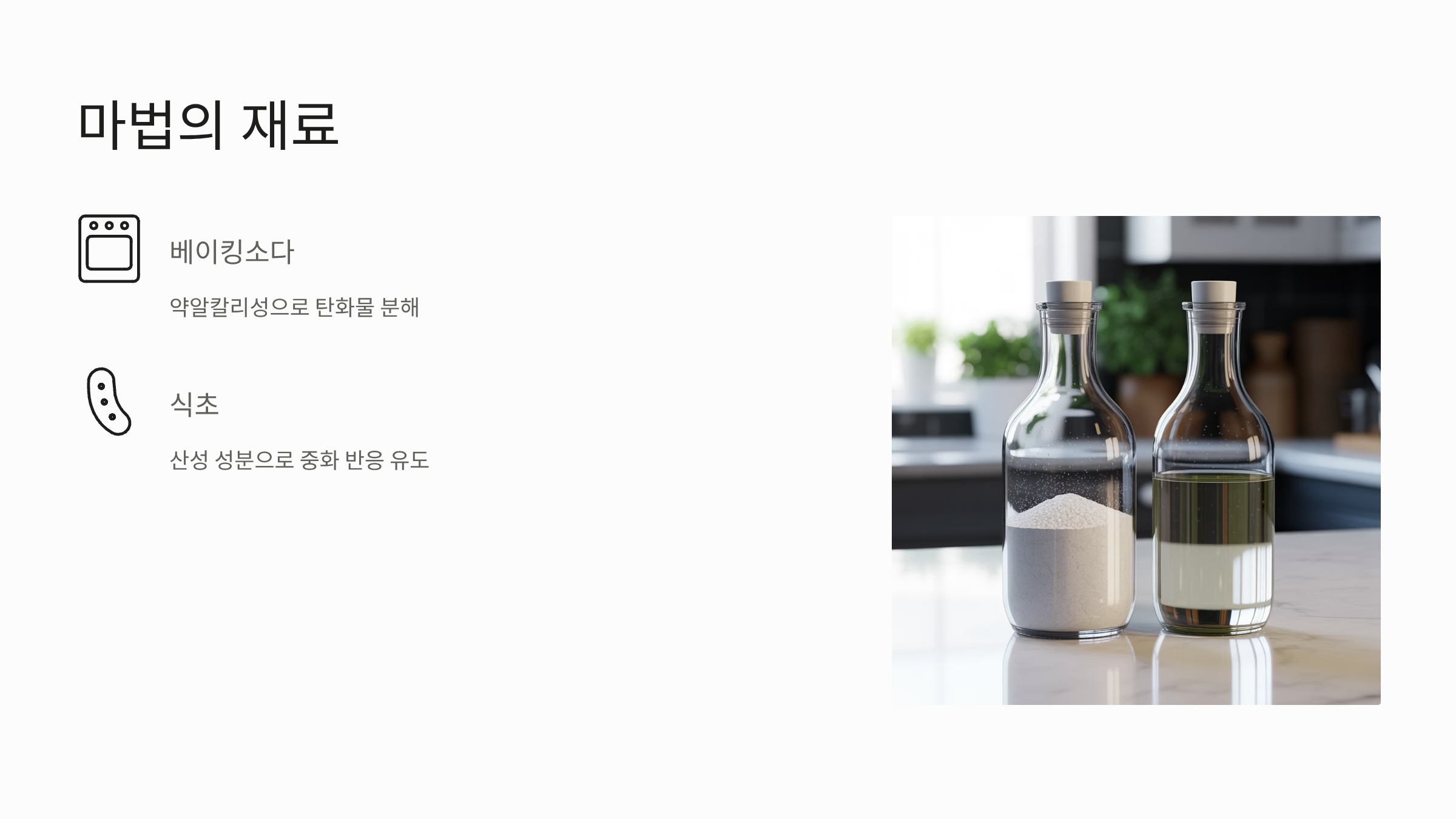 - 식초+베이킹소다 활용 (강력한 중화 반응):