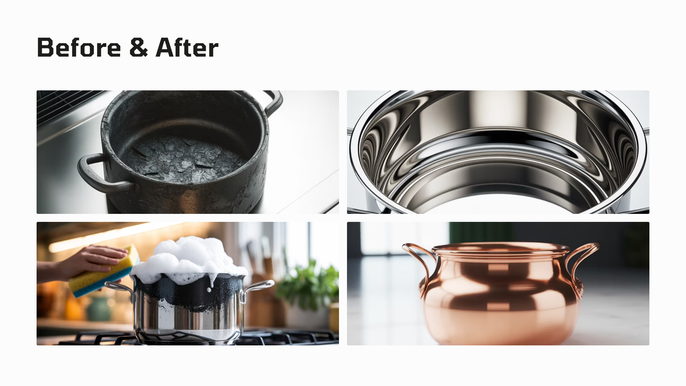 탄 자국을 제거한 후 냄비의 외부에 남은 얼룩이나 광택을 잃은 부분을 복원하는 마무리 관리 팁입니다.