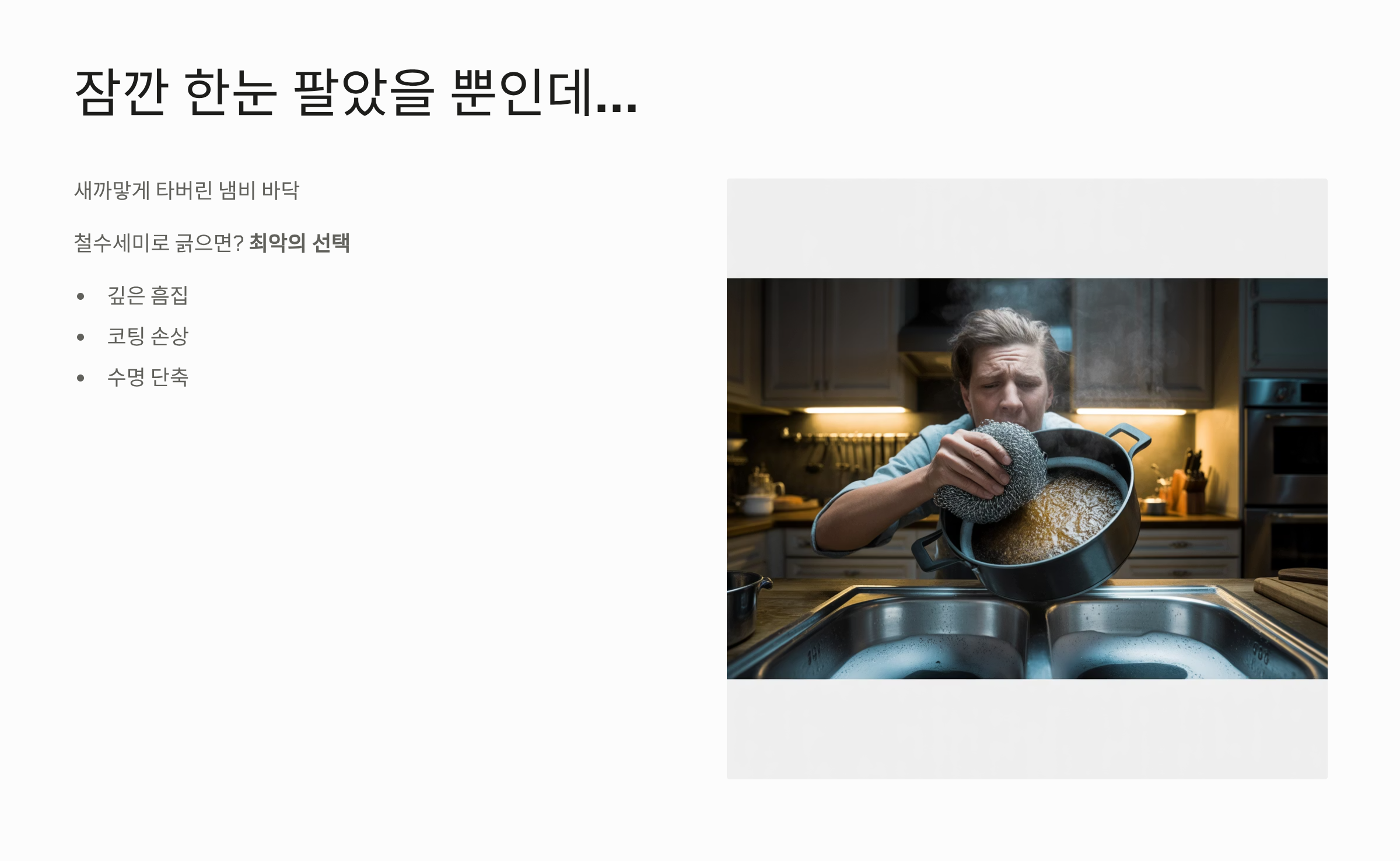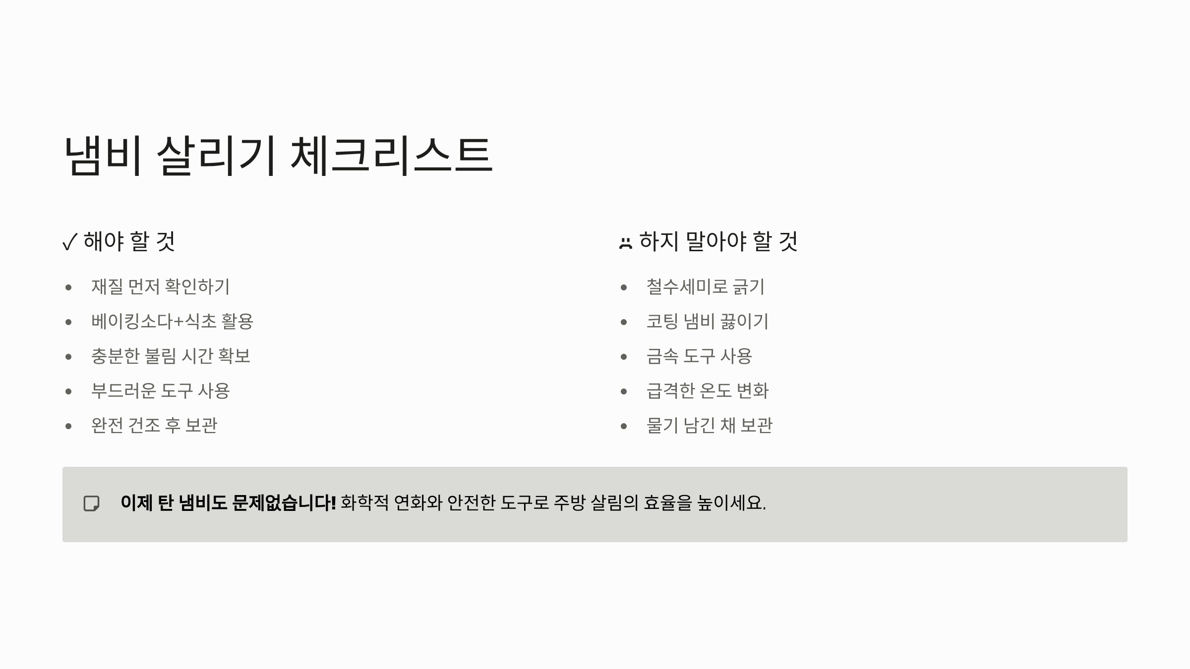 - 금기사항: 철수세미 사용은 냄비 표면에 미세한 흠집을 남겨 광택을 잃게 하고, 이후 음식물이 더 잘 눌어붙게 만듭니다. 금속 도구로 긁어내는 것을 피해야 합니다.