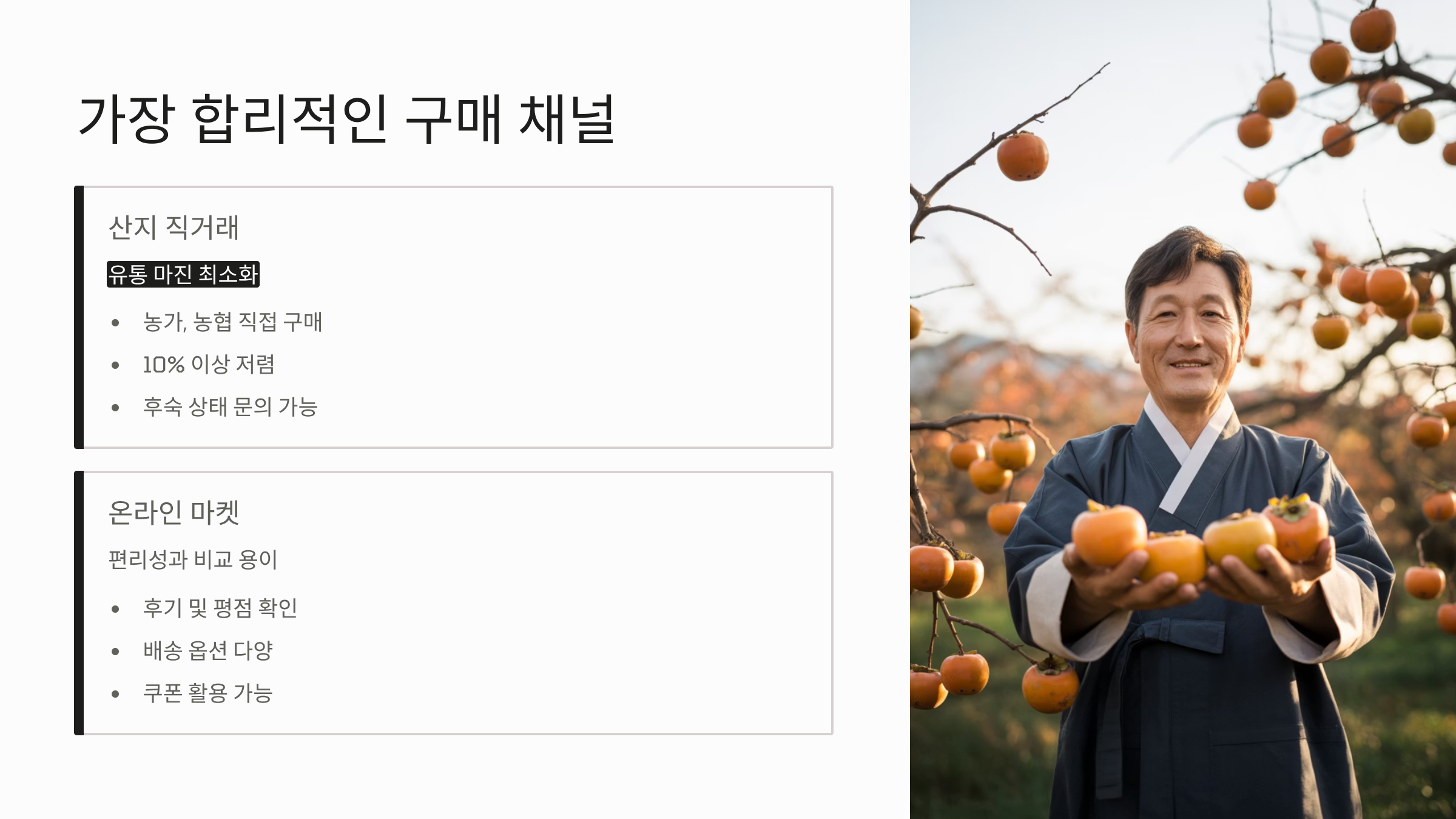 - 서비스 품목: 후숙을 돕기 위해 사과(에틸렌 가스 제공)를 함께 넣어주거나, 홍시 만드는 노하우를 담은 안내문이 포함된 제품은 서비스 가치가 더해진 것으로 볼 수 있습니다.