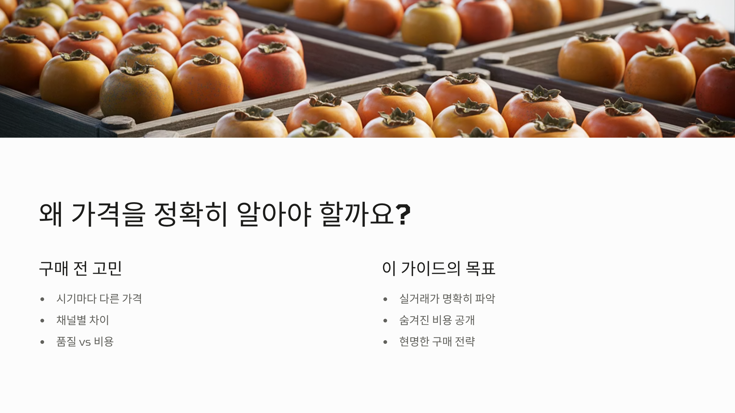 하지만 구매 시점에 따라 대봉감 10kg 가격이 천차만별이고, 광고성 정보 속에서 실제 시장 가격을 파악하기란 쉽지 않습니다. 제대로 된 실거래가를 알지 못하면 비싼 가격을 주고도 낮은 품질의 감을 구매할 수 있습니다.