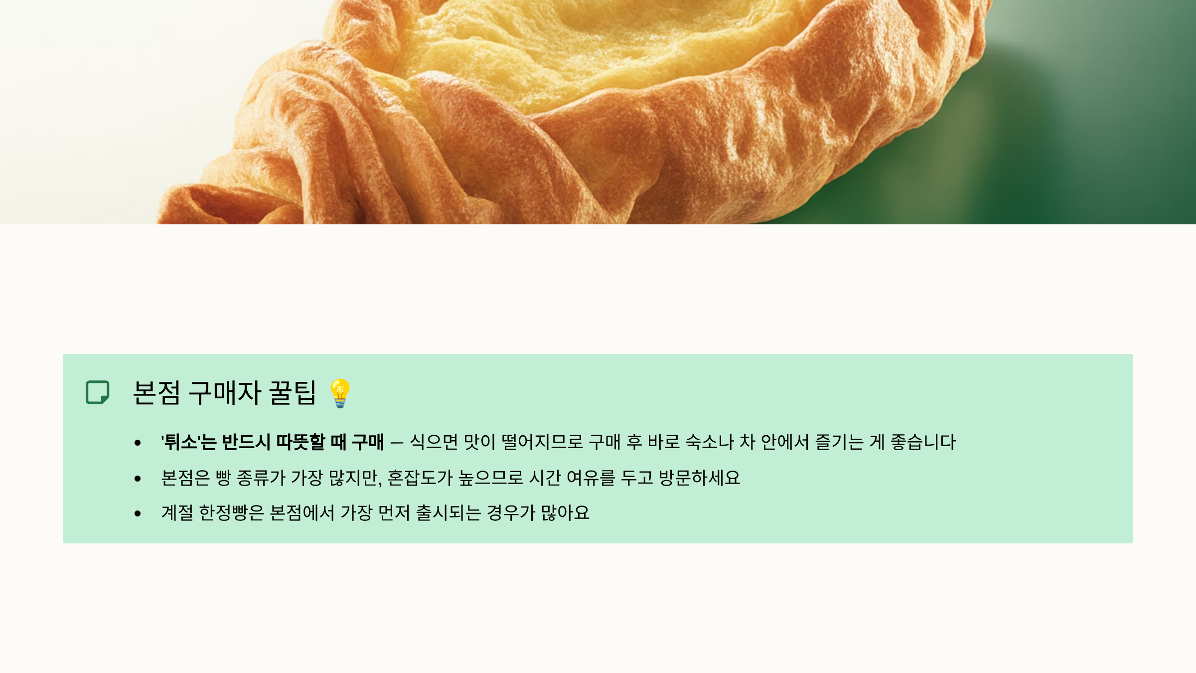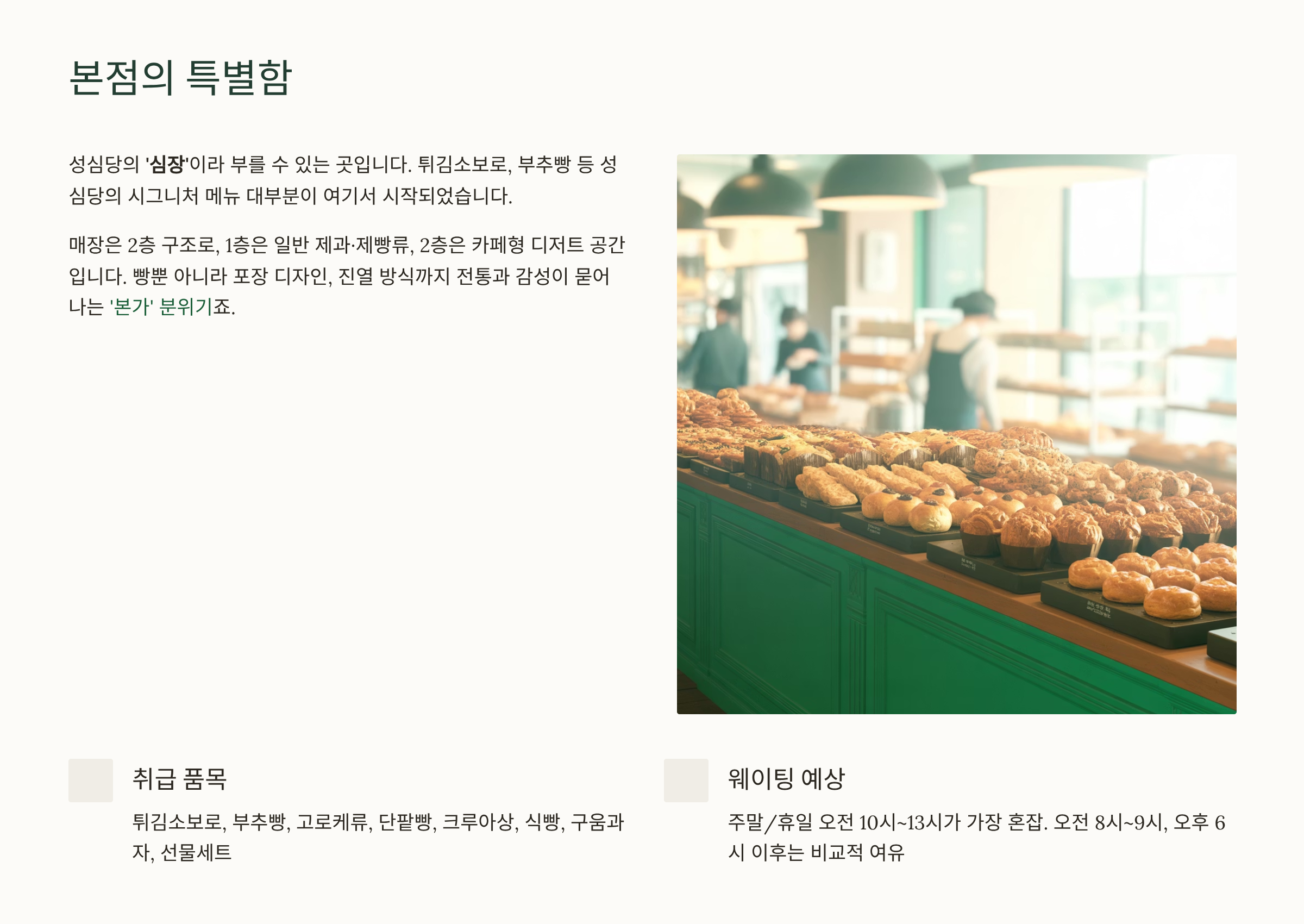 - 본점은 빵 종류가 가장 많지만, 혼잡도가 높으므로 시간 여유를 두고 방문하세요.