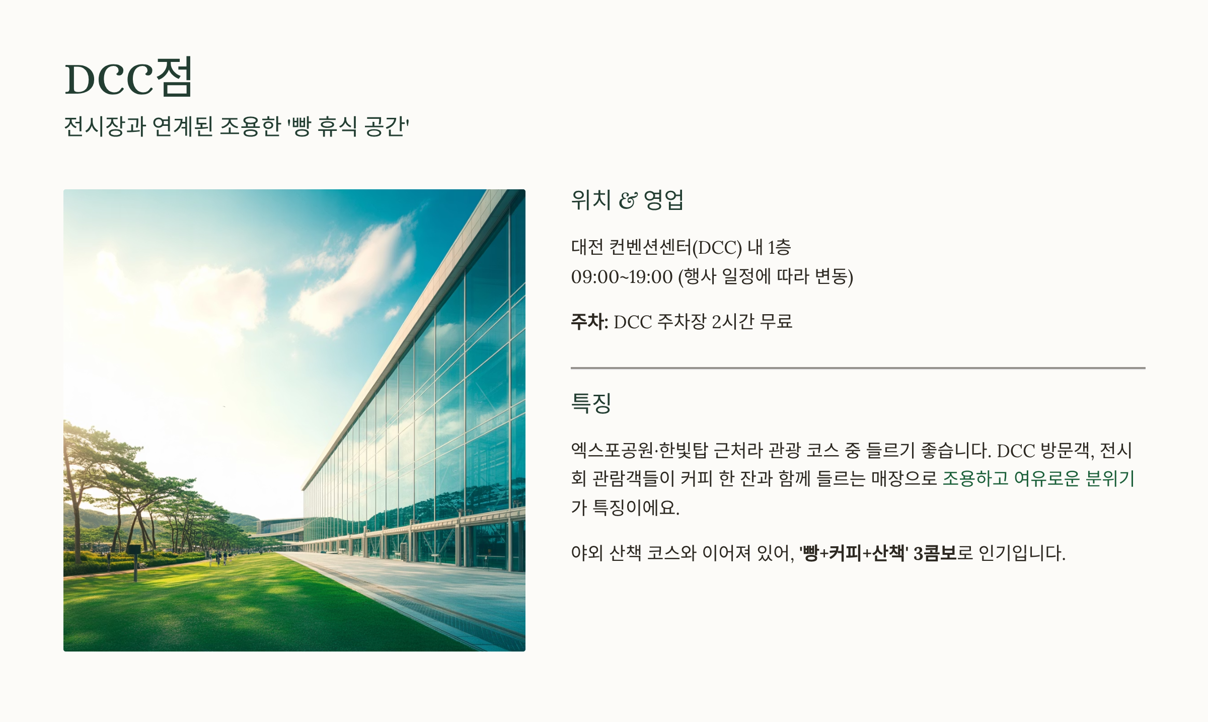 | DCC점 | 조용하고 한산, 커피와 함께 | 없음 | 무료(2시간) | 관광객, 한밭수목원 연계코스 |