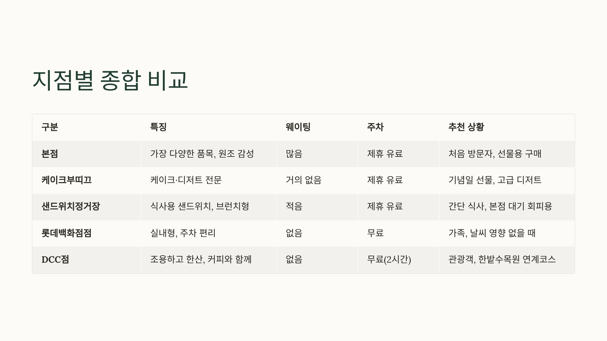 | 본점 | 가장 다양한 품목, 원조 감성 | 많음 | 제휴 유료 | 처음 방문자, 선물용 구매 |