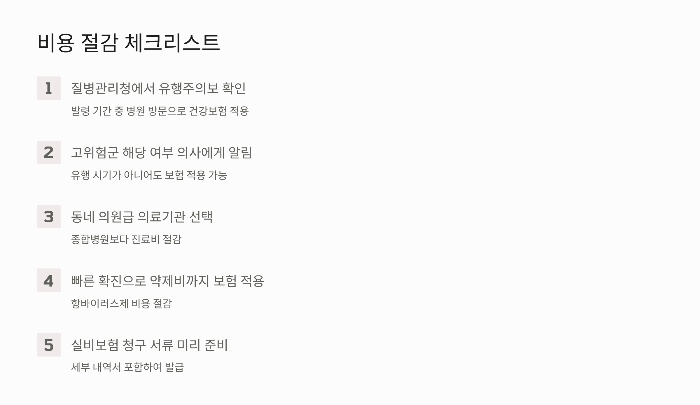 - 비용 절감 팁: 독감 검사비용을 아끼기 위해 검사를 미루기보다, 빠르게 확진을 받아 항바이러스제 비용까지 보험 적용을 받는 것이 총비용을 절감하는 핵심입니다.
