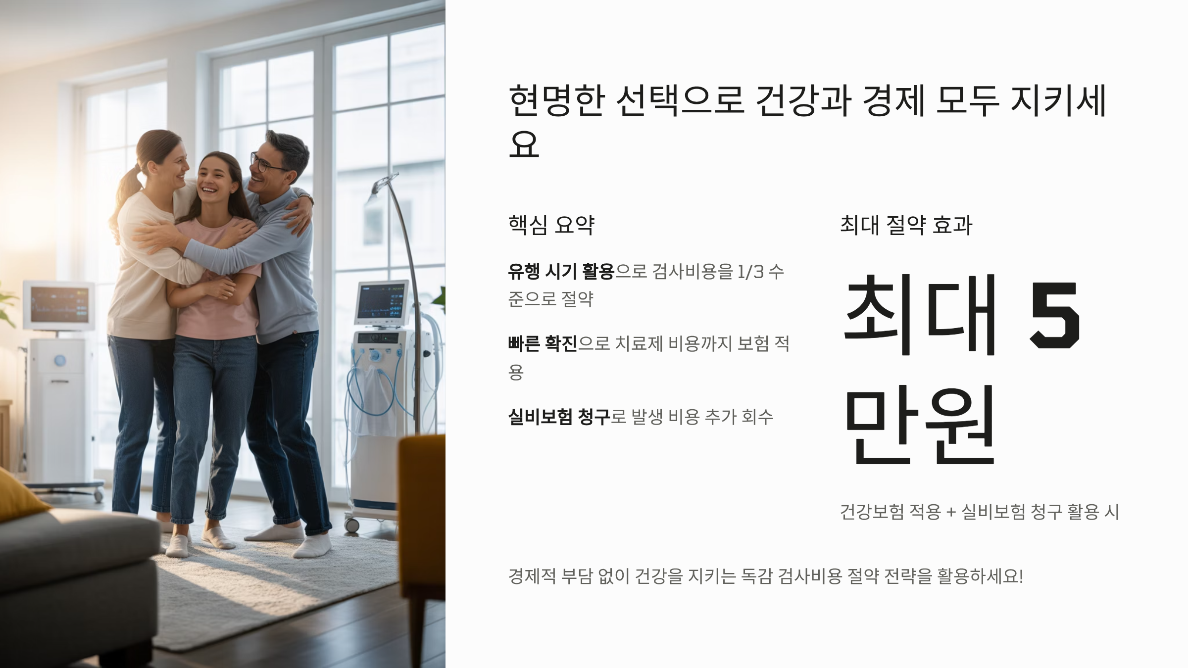 이를 통해 비급여 비용 대비 약 1/3 수준으로 검사를 받을 수 있습니다. 검사를 미루지 않고 빠르게 확진을 받아 항바이러스제 비용까지 보험 적용을 받는 것이 총지출을 절약하는 핵심입니다.