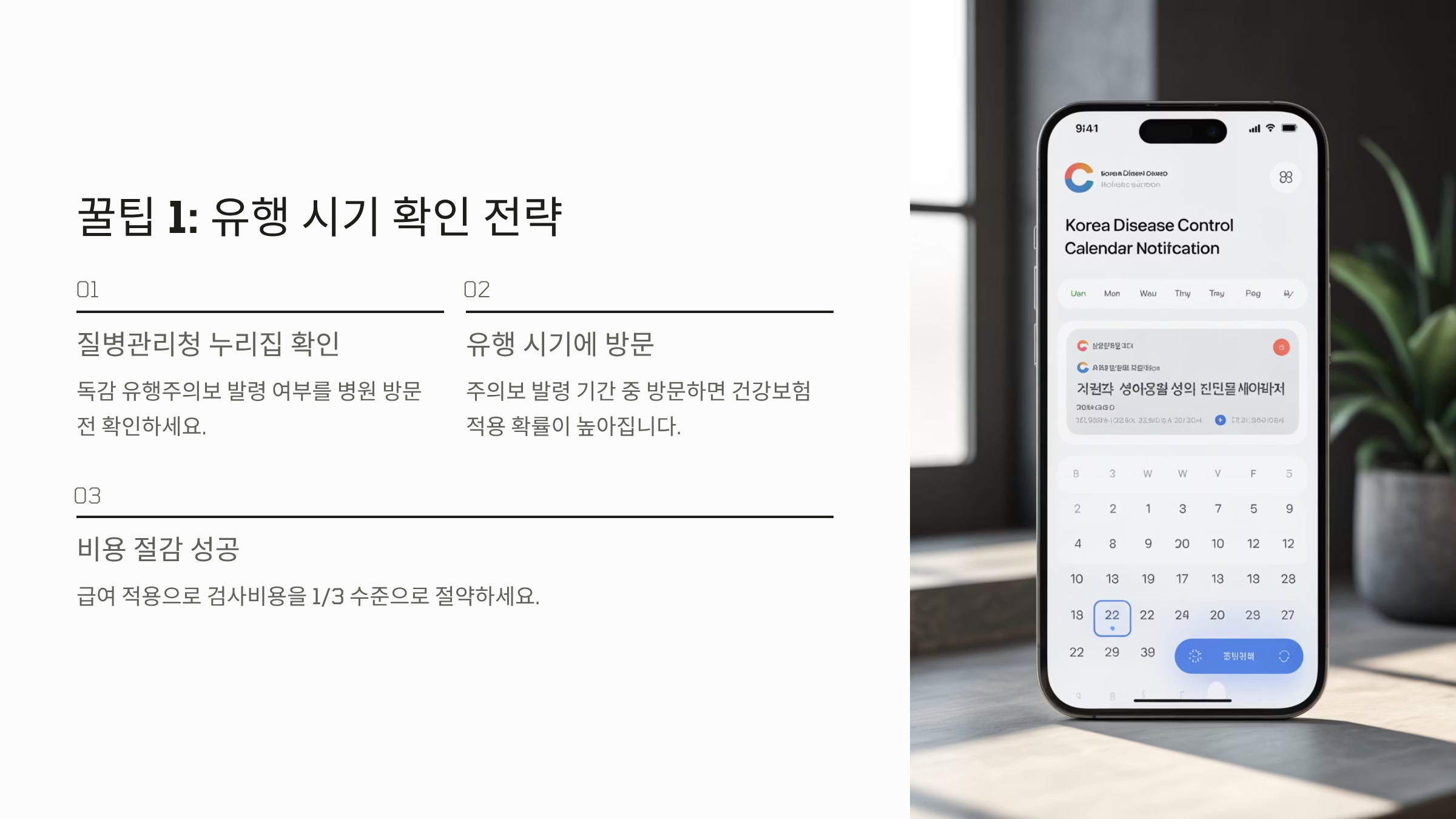 - 유행 시기 확인 전략: 질병관리청은 매년 독감 환자가 급증하면 '독감 유행 주의보'를 발령합니다. 이 주의보가 발령된 시기부터는 건강 보험이 적용될 확률이 매우 높아집니다. 병원 방문 전 질병관리청 누리집을 통해 유행 주의보 발령 여부를 확인하고 방문하는 것이 좋습니다.