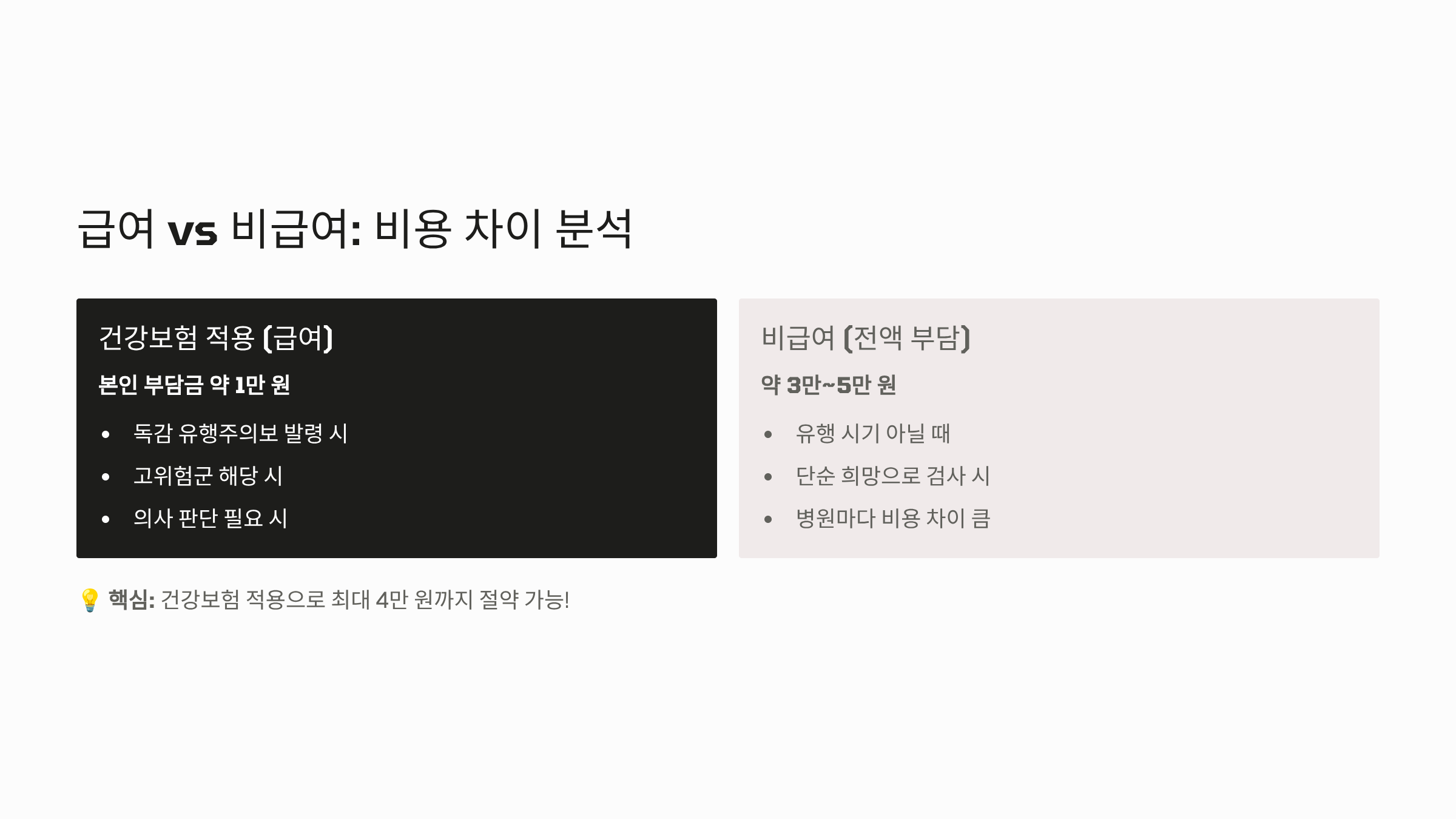 요즘 유행하는 독감 검사비용이 급여(보험 적용)와 비급여(본인 부담)에 따라 얼마나 달라지는지 분석합니다.