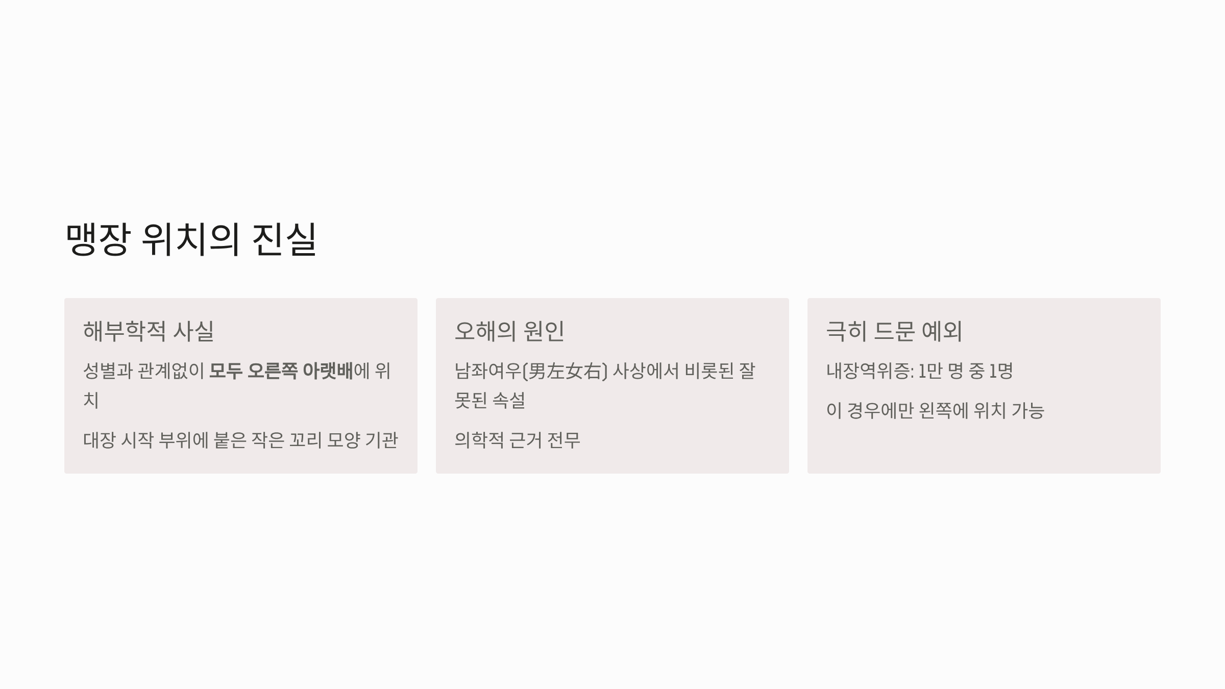 - 예외적인 경우: 극히 드물게 '장기 좌우 바뀜증(내장역위증)'을 가진 사람의 경우에만 맹장이 왼쪽에 있을 수 있으나, 이는 1만 명 중 1명꼴로 나타나는 매우 희귀한 사례입니다.