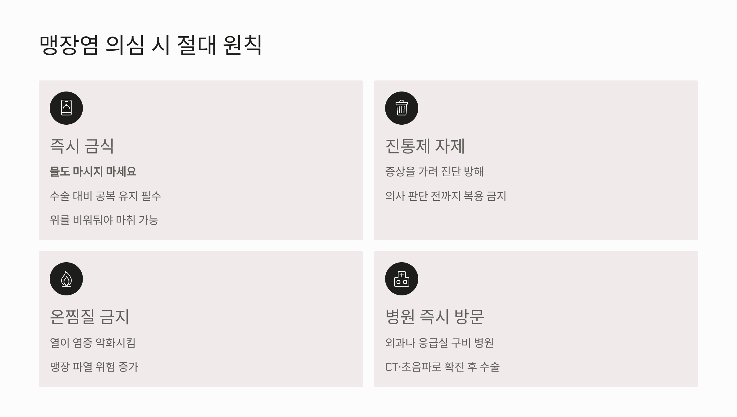 - 온찜질 금지: 배가 아플 때 습관적으로 핫팩이나 온찜질을 하는 경우가 많은데, 맹장염일 경우 염증 부위에 열을 가하면 혈류량이 늘어 염증이 악화되거나 맹장이 터질 위험이 높아지므로 피해야 합니다.