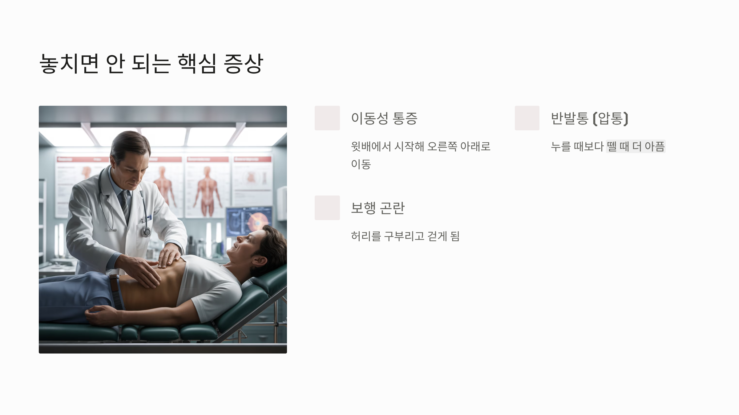 - 보행 시 통증: 염증이 심해지면 허리를 펴고 걷기가 힘들어집니다. 오른쪽 아랫배가 당겨서 허리를 구부리고 걷게 되거나, 오른쪽 다리를 들어 올릴 때 통증이 심해질 수 있습니다.